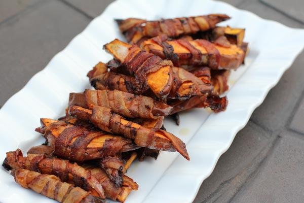 간단한 술 안주로 제격인 고구마 베이컨말이는 삶은 고구마를 손가락 크기로 썬 후 베이컨을 돌돌 말아 프라이팬이나 오븐에 굽기만 하면 된다. 오븐에 구울 경우 피자 치즈와 파슬리 가루를 곁들여 200도 온도에서 15분간 구우면 되는 이 요리는 맥주 안주로 많은 사람들의 사랑을 받고 있는 고구마 요리 가운데 하나다.