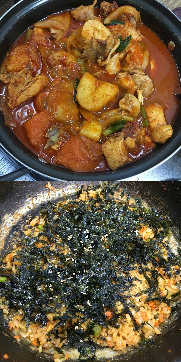 닭볶음탕답게 국물도 푸짐하게 내어준다. 엄나무, 닭발, 각종 채소를 넣어 끓여낸 육수는 끓일수록 깊은 맛이 배가 된다. 초벌로 한 번 끓여 제공하지만, 다진 마늘이 국물과 닭고기에 충분히 배어들도록 뭉근하게 끓여야 맛이 우러난다. 닭고기를 찍어 먹는 간장소스도 일품이다. 손님상에 나가기 전에 한 번 더 끓여 내어주기 때문에 풍미가 좋다. 얼큰한 국물까지 흡입하고 나면 마무리로 칼국수 또는 볶음밥 중 선택할 수 있는데, 볶음밥은 평일 오후 5시까지만 가능하다.