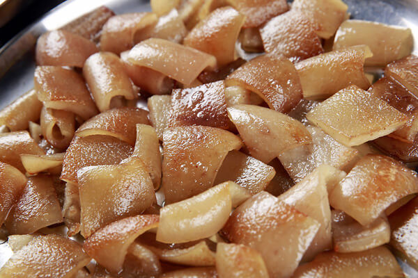 포장마차와 잘 어울리는 안주 돼지껍데기. 두터운 마니아층을 보유하고 있는 안주인만큼 돼지껍데기는 포장마차에서도 인기가 많다. 간장 양념에 살짝 재워 달짝지근하고 쫄깃쫄깃한 식감에 자꾸만 손이 가는 매력이 있다. 팡팡 터지는 소리와 함께 바싹하게 익은 돼지껍데기를 고소한 콩가루에 찍어 먹으면 더할 나위 없이 맛있다. 고춧가루 양념에 버무려 대파, 양파와 볶아 먹어도 잘 어울린다.