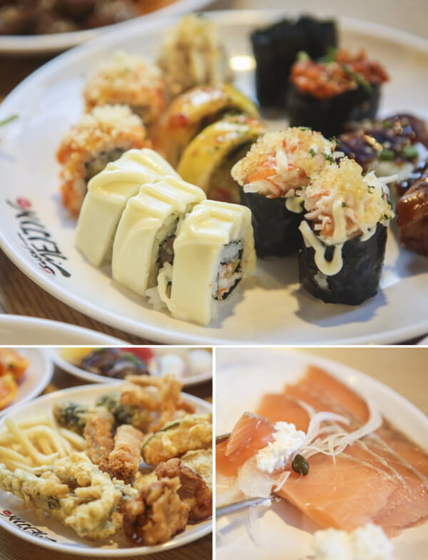 ‘스시메이진’의 스시는 밥(샤리)무게가 12g을 초과하지 않는 것이 특징이다. 샤리는 크고, 네타가 작은 일반 초밥 뷔페와 달리 샤리에 비해 큼직하게 썰어진 네타를 올린다. 이렇게 만든 초밥은 장어, 생새우, 간장 새우, 연어 등 롤을 포함해 10여 가지의 다양한 종류를 제공하고 있다. 이곳은 스시도 유명하지만, 남다른 퀄리티의 샐러드바로 더욱 유명하다. 치킨, 우동, 갈비, 타코야끼, 크로크무슈 등 먹을 것이 풍부하다. 특히 디너 타임에는 각종 튀김류는 직접 튀김기에 튀겨 따끈하게 즐길 수 있다. 또한, 간장 새우와 연어사시미도 무한으로 즐길 수 있다. 디너 가격이 조금 센 편이지만 메뉴도 다양하고 퀄리티도 훨씬 훌륭하다.