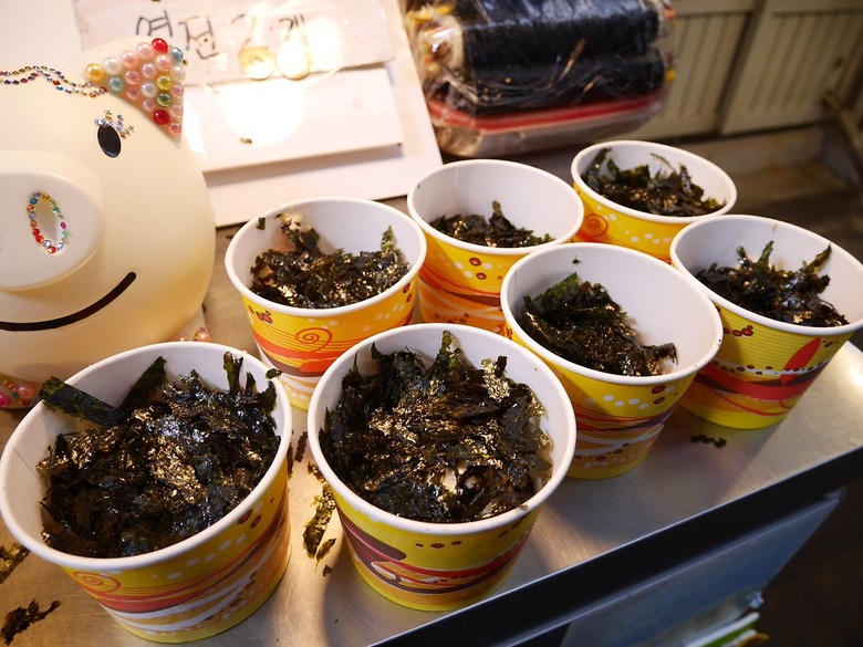 평소 순대를 좋아하는 사람이라면 강력 추천하는 순대볶음. 분식집에서는 순대만 판매하고, 음식점에서는 대량으로 판매하기 때문에 늘 먹기 망설였다면 통인시장에서는 1인 분량을 엽전 냥으로 구매할 수 있다. 매콤한 양념이 진하게 배어든 순대는 탱글탱글하니 맛도 좋고 여기에 깻잎 향이 더해져 더욱 먹음직스럽다.
