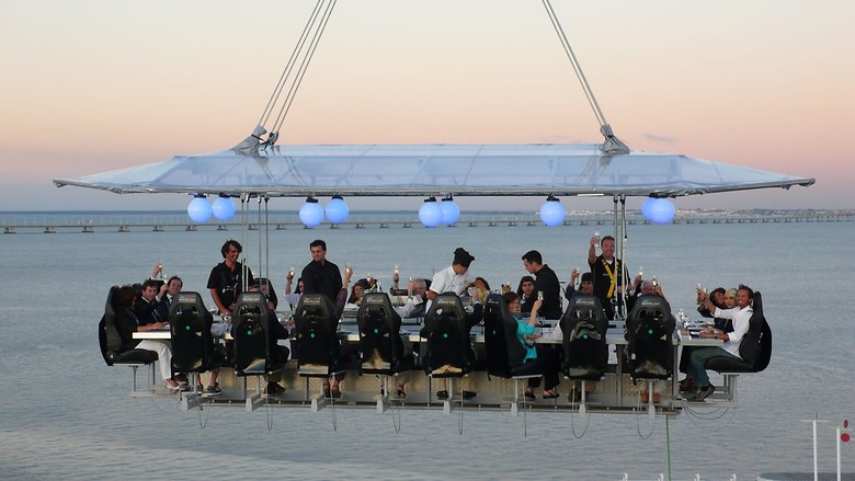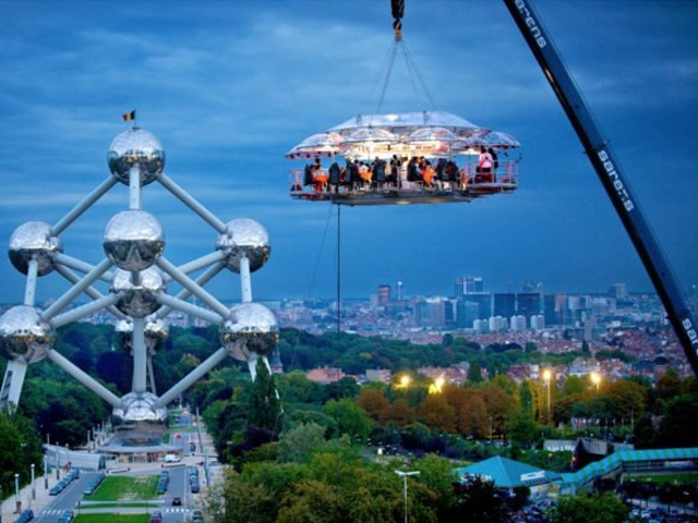 하늘에서 밥을 먹는 꿈같은 일이 현실로 이루어진 ‘디너 인 더 스카이’. 2006년 음식 전문 에이전시 ‘하쿠나 마타타’에서 놀이기구 설치 전문회사와 합작하여 만든 공중 레스토랑으로 지상 45m 상공에서의 짜릿한 식사를 즐길 수 있다. 대형 테이블을 가운데 두고 의자가 둘러싸여 있으며, 중앙엔 요리사와 웨이터들이 움직일 수 있는 중앙키친이 있다. 모든 탑승객은 안전벨트를 필수로 해야 하며, 조그마한 발판을 지지대 삼아 식사한다. 총 22명까지만 탑승 가능하며, 최대 8시간까지 탑승할 수 있다. 식사는 총 5개 코스로 한번 식사하는데 걸리는 시간 1시간 30분이다. 비용은 258유로 한화로 약 37만원 정도. 이 레스토랑은 현재 아랍에미리트 아부다비, 독일 뉘르부르크, 체코 프라하 등 전 세계 45개국에서 진행 중이며, 사전 예약을 통해서 운영 중이다.