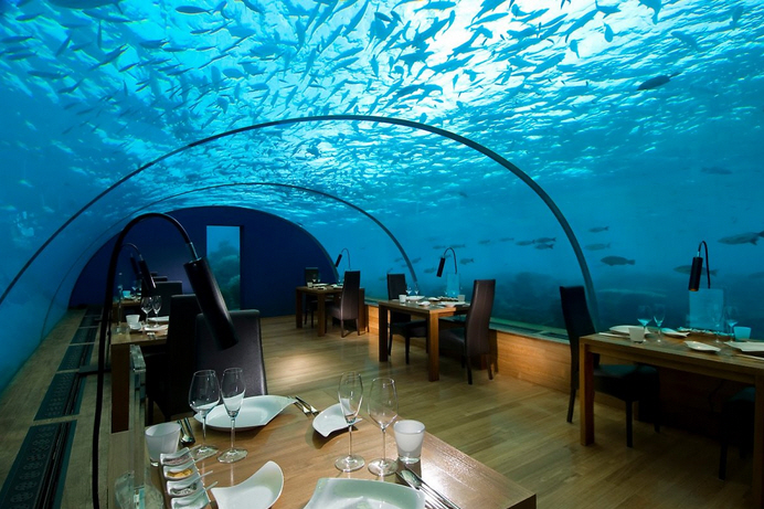 마치 인어공주가 된 듯 바다속에서 식사를 할 수 있는 이곳은 몰디브에 위치한 랑갈리 섬에 위치한 ‘이타 언더 씨 레스토랑’이다. 2005년 세계 최초로 만들어준 수중 레스토랑으로, 한때 세계에서 가장 아름다운 레스토랑 1위로 선정되기도 했다. 수심 5m에 아래에 있는 이 레스토랑은 아쿠아리움처럼 둥근 해저 터널 안에서 수많은 물고기를 보면서 식사할 수 있다. 천장은 바다 속이 보이는 유리로 되어 있으며, 바닷 물결에 따라 빛이 산란되기 때문에 마치 오로라처럼 신비한 느낌이 든다. 테이블은 단 6개로, 예약제로만 운영된다.