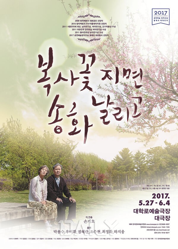 연극 '복사꽃 지면 송화 날리고'는 2017 공연예술창작산실 올해의 레퍼토리 선정작으로, 2009 창작팩토리 대본 공모에 선정된 이후 각종 수상을 통해 호평을 받았던 작품이다. 우주 속에서의 인연을 다루는 연극으로, 삶과 죽음, 시간과 공간, 일상에서 인연과 마주한 이야기를 다룬다.