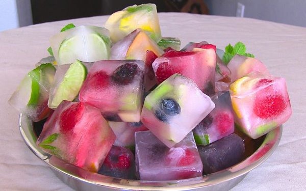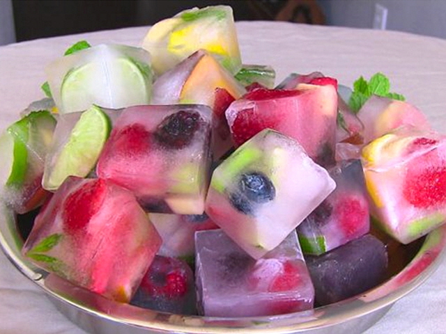 그냥 씹어 먹어도 너무 맛있을 것 같은 과일 얼음을 만들어보자. 얼음 트레이에 과일을 조각조각 잘라 넣고 물을 부어 얼리면 된다. 이때 꿀을 섞은 물을 사용해도 괜찮다. 과일 2~3가지 종류를 조그맣게 썰어 같이 얼리면 알록달록한 색감이 어우러지면서 훨씬 먹음직스러워진다. 이렇게 얼린 얼음은 탄산수와 함께 섞어 시원한 음료로 마셔도 좋고 화채에 동동 띄워 먹어도 좋다.