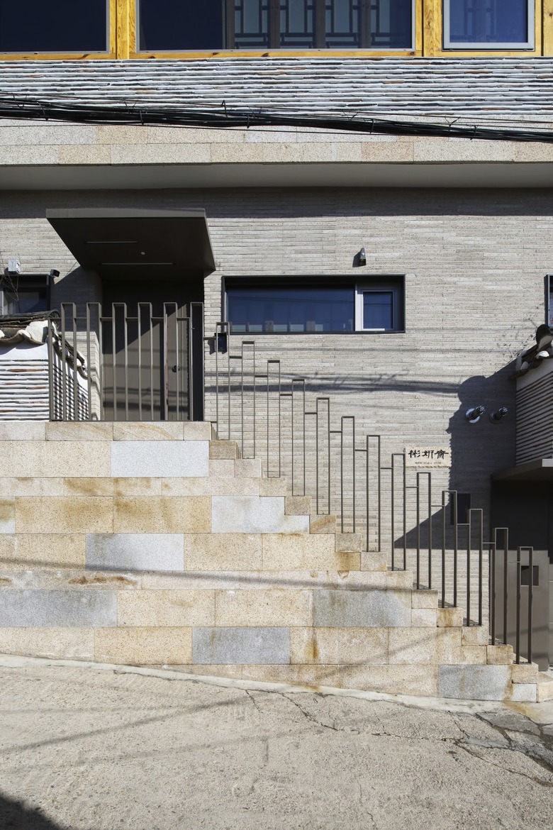 바깥에서는 기존의 콘크리트 벽 위 도장이라는 단순한 마감 대신 전국에서 확보한 가지각색의 화강암과 마찬가지로 다양한 컬러의 와편을 이용해 ‘서울 한옥’이라는 일체감을 주었다.