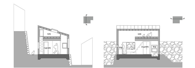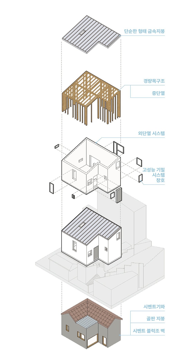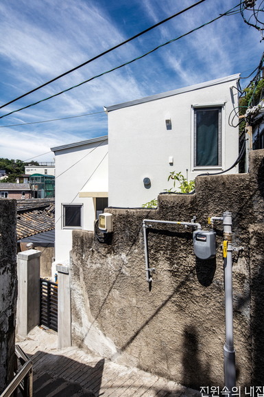 AnLstudio(에이앤엘스튜디오) 건축사사무소는 처음 현장의 모습을 회상하며 다시 사용할 수 있는 부분이 거의 없는 폐가 수준이었다고 전했다. 하지만 건축주가 대지와 건축물이 처한 상황을 정확히 이해하고 있었고, 예산과 설계의 방향, 그리고 대수선의 목표를 분명하게 의뢰해 왔기 때문에 프로젝트를 진행할 수 있었다고 한다. 너무 당연한 목표일 수 있지만, 이번 프로젝트의 경우 건축물대장상의 건폐율과 용적률을 변경하지 않는 선에서 현대적인 생활 공간을 확보하는 것을 목표로 삼았다. 건축사사무소는 기존 벽체의 외벽 위치를 그대로 유지하고 경량목구조로 변경하면서 구조와 단열의 두께를 줄이는 방식을 택했다. 여기에 외단열 마감 시스템을 적용해 최선의 단열 성능을 확보할 수 있도록 계획했다. 차량이나 장비가 진입할 수 없는 조건에서 부분적인 해체와 주요 구조부의 교체는 모두 사람이 운반할 수 있는 자재를 사용해야 했고, 이는 경량목구조를 적용한 이유이기도 했다. 또한 무너진 지붕 구조의 형태를 조절하고, 대지의 경사를 활용해 기존 건물의 레벨을 낮추는 방법으로 건축물의 높이 증가 없이 공간의 부피를 조금이라도 더 확보하는 전략을 세웠다.