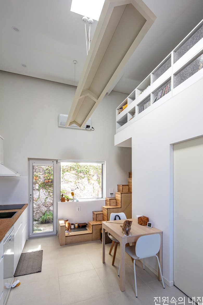 ![]() 다락에서 내려다 본 거실 및 주방. 욕실과 현관 등 구분되어야 하는 공간의 배치를 고정한 후 일상 생활이 이루어지는 공간을 구성하는 방식으로 실내 구조를 계획했다. |