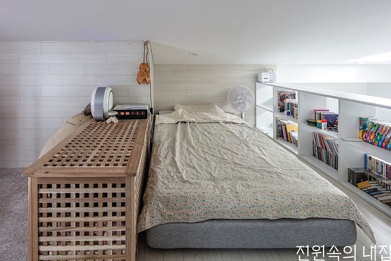 ![]() 다락의 침실 공간. 낮은 파티션으로 침대를 분리시켜 주었다. |
