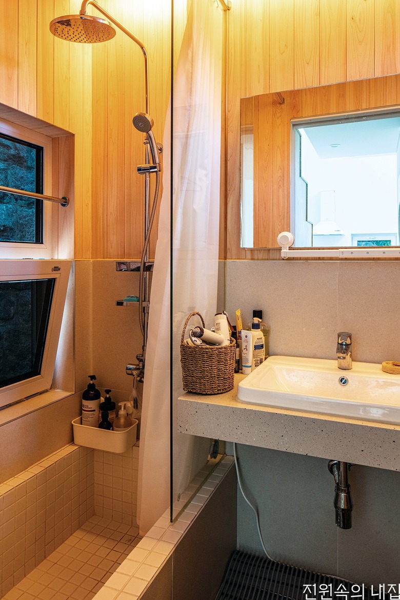 (왼쪽) 다락으로 올라가는 계단은 디딤판을 지그재그 형식으로 설치해 사람과 고양이의 발걸음을 모두 고려했다. 앉아서 뒷마당을 내다보는 벤치의 역할도 한다. (오른쪽) 세탁실을 지나 집의 가장 안쪽에 욕실이 위치한다. |