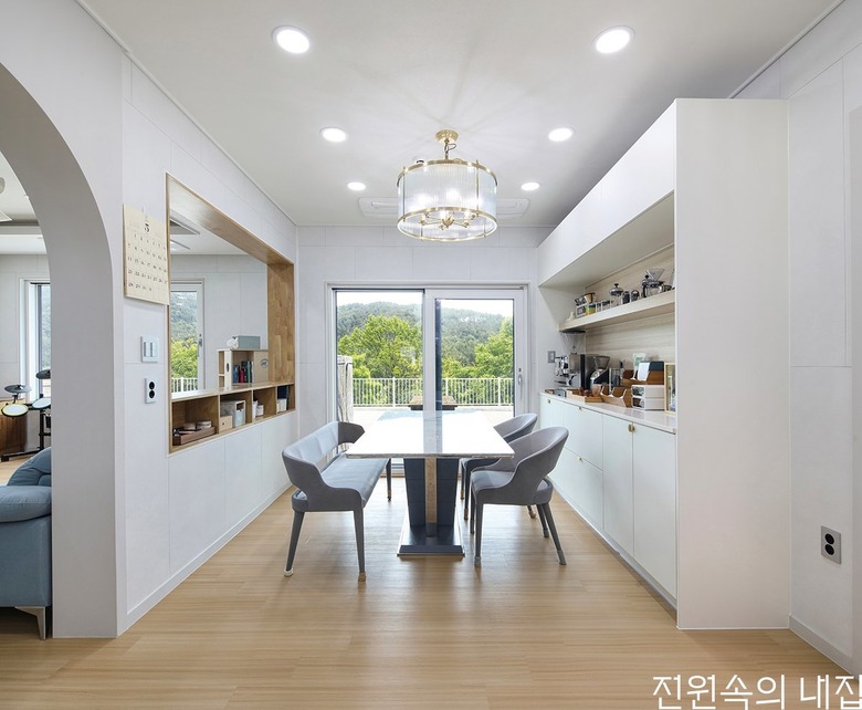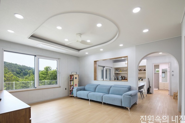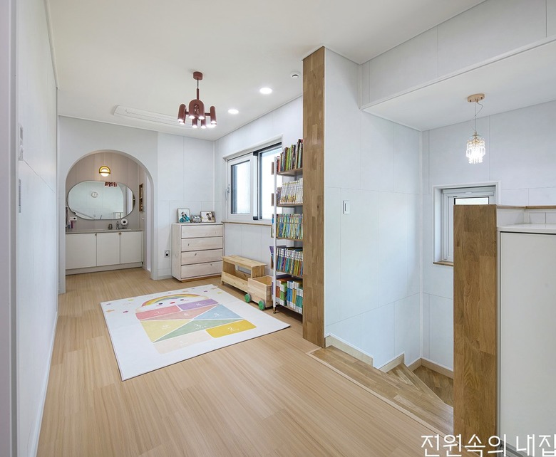 아치게이트와 아치형 우물 천장 디테일이 포근한 느낌을 자아낸다. 주방이나 다이닝룸에서 거실과 편하게 소통할 수 있도록 액자형으로 열린 가벽을 설치했다. 아이들이 사는 집의 특성을 살려 쉽게 훼손되는 벽지 대신 디자인 월을, 강화마루 대신 에코 돌마루를 시공했다. |