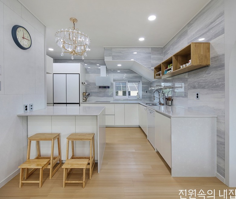 넓은 조리 공간을 자랑하는 ㄱ자 구조의 주방. 간편하게 이용할 수 있는 미니 바테이블도 두었다. |