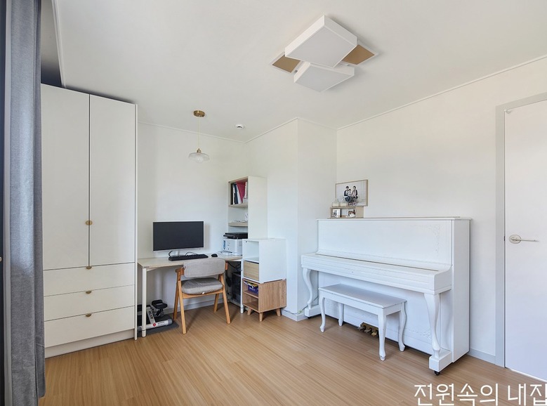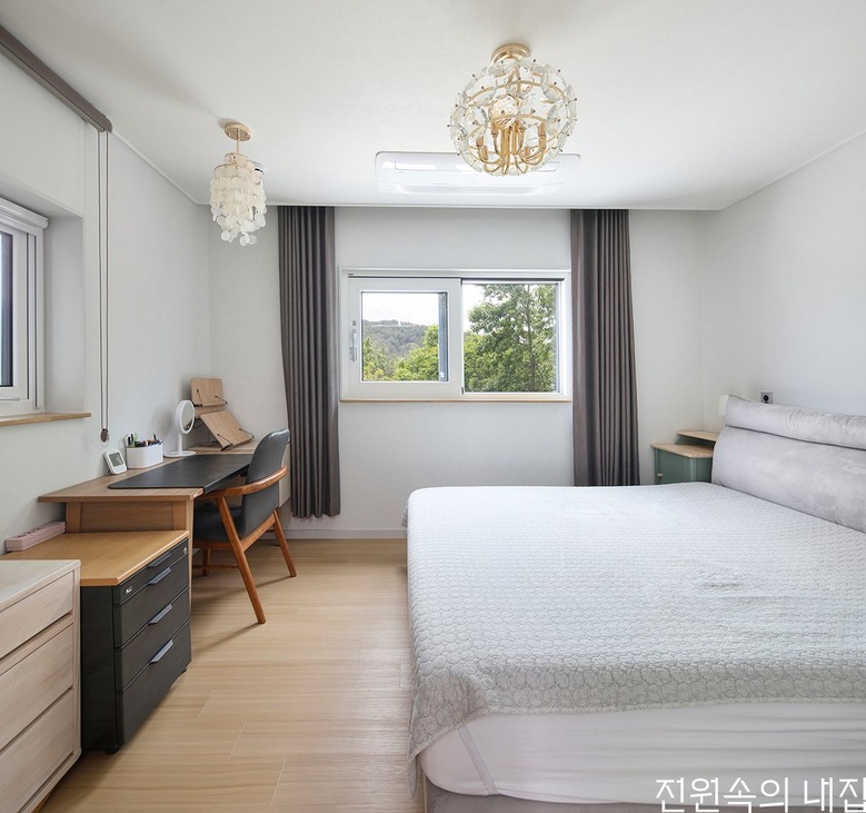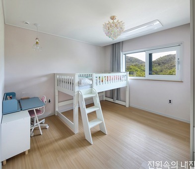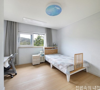 침대와 책상, 옷장으로 쾌적하게 구성된 아이들의 방. 11살, 9살, 7살로 두 살 터울의 삼남매는 각자 방의 조명을 직접 골랐다. 아이들이 성장해 가면서 취향대로 채워나갈 방에는 산세의 풍경이 가득 담긴다. |