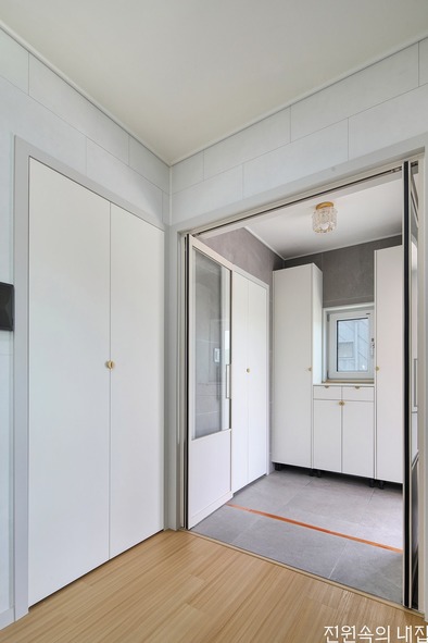 현관에는 각종 공구를 보관하는 팬트리와 보조 수납 창고를 만들었다. 귀가 후 현관에서 가방과 옷가지 등 소소한 짐들을 바로 수납장에 정리하기 위한 아이디어였다.(왼쪽) / 현관에서 들어오면 왼편에 바로 외부 세면대와 욕실이 구성되어 있어 편의를 더했다.(오른쪽)