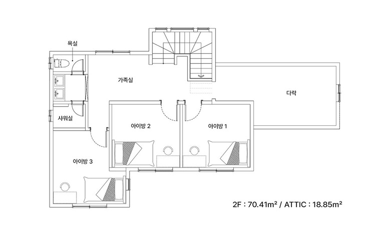 (위, 아래) 병렬식으로 나열된 세 아이의 방 앞으로 다같이 모일 수 있는 거실이 있다. 이곳에서 책을 읽거나 함께 놀이를 한다. 오른쪽에는 넓은 다락 공간이 숨겨져 있다. |