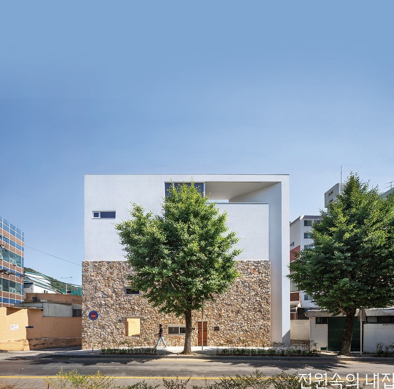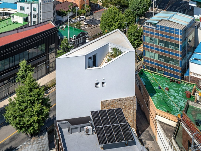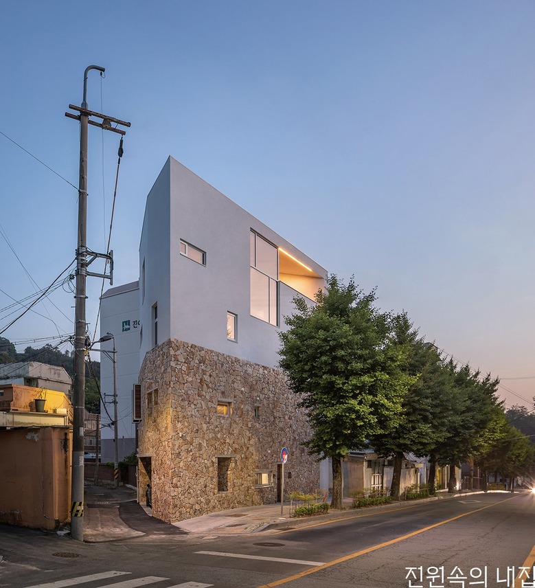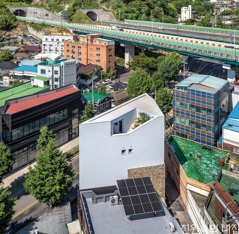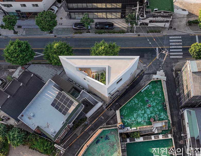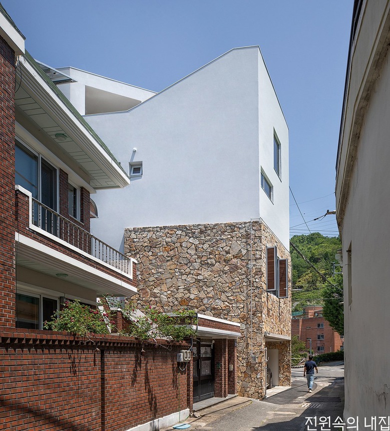 도심 속 삼각형 땅에 지어진 돌집. 느슨함과 유연함으로 어느새 도시에 녹아든다.
