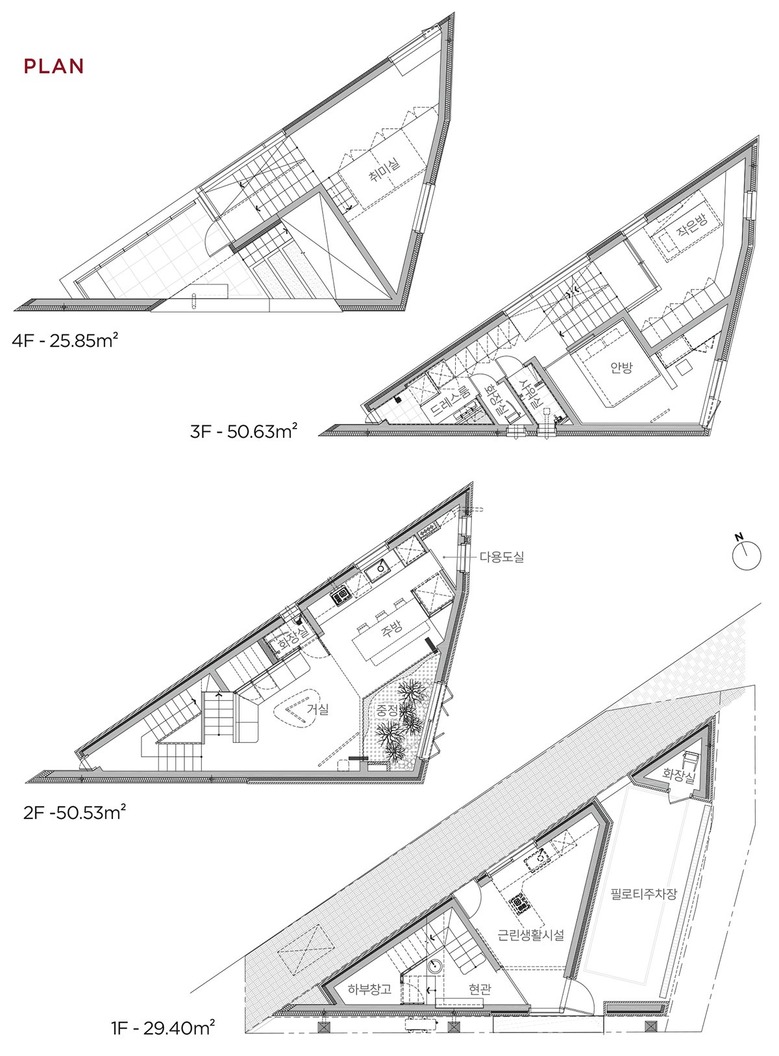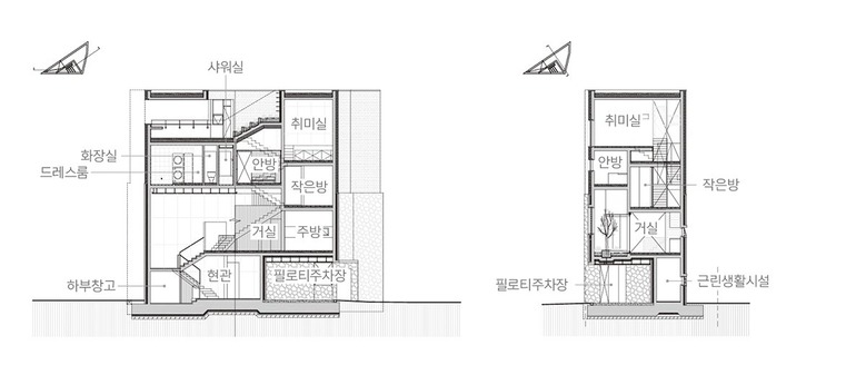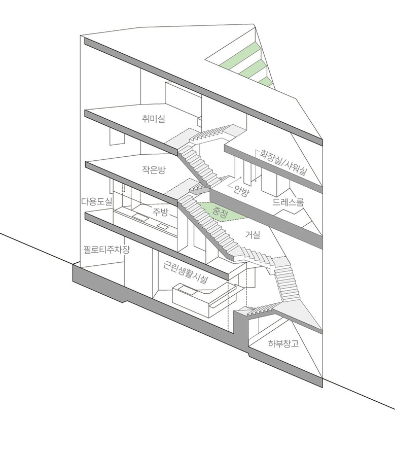 평면설계에서는 소음이 빈번한 북, 서측 도로와 폐쇄된 남측에 접하는 벽은 개구부의 설치를 최소화하고 유일하게 개방된 동측 벽을 적극적으로 활용하여 채광과 환기를 충족시키고자 하였다. 내부는 스킵 플로어를 활용한 높이 변화로 거실의 개방감을 확보하고 동선 측면에서 층간 이동의 부담을 줄이고자 하였다. 별도 실로 구획하지 않은 계단 동선은 층별 기능 공간들과 충돌하지 않도록 경로를 설정하여 공간 활용과 동선 효율을 높였다.