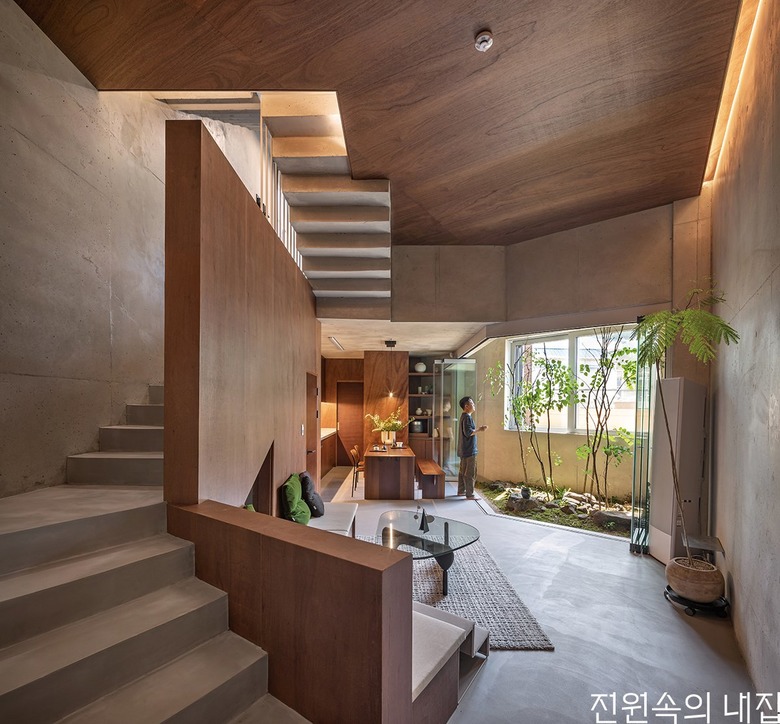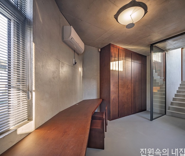 내부마감재 ≫ 벽 - 노출콘크리트, 강화제 / 바닥 - 마이크로시멘트 / 천장 –MLH 합판 + 컬러 스테인