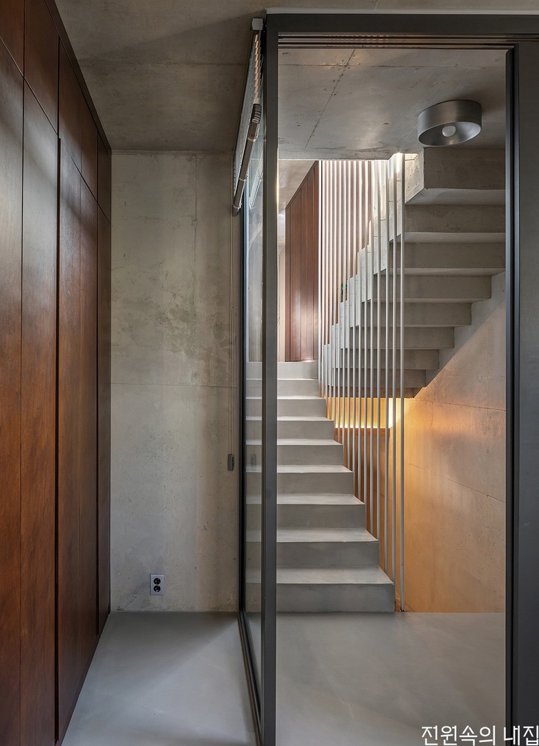 ![]() 작은 방과 계단 사이에는 유리로 된 문을 두어 느슨하게 경계를 지었다. |