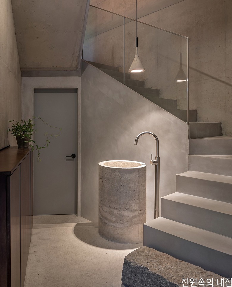 거친 마감의 통석 디딤돌과 콘크리트 원형 세면대, 낮은 조도의 팬던트 조명이 연출하는 전실 분위기는 좀 더 사적이고 내밀한 공간으로의 전환을 암시한다. |