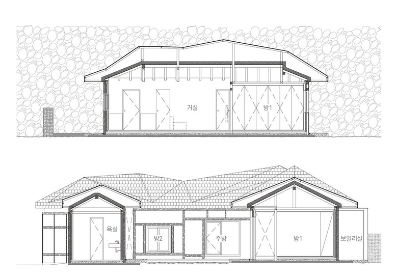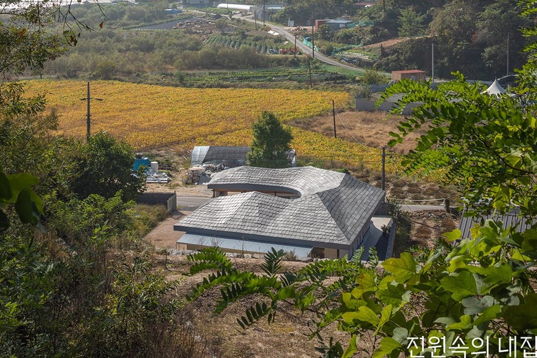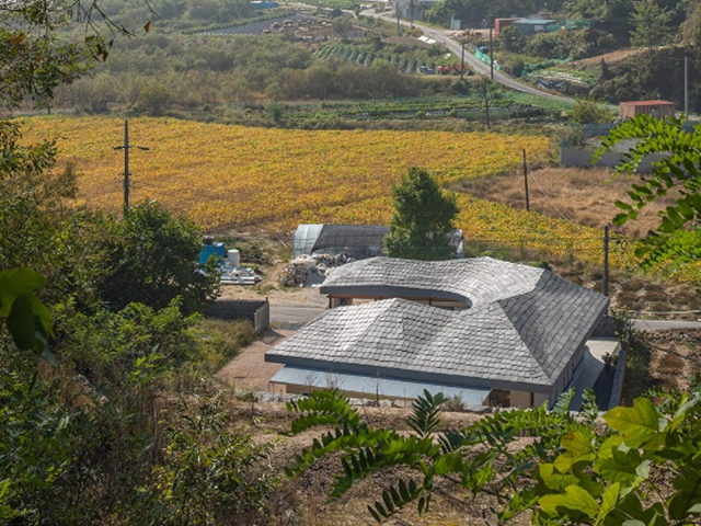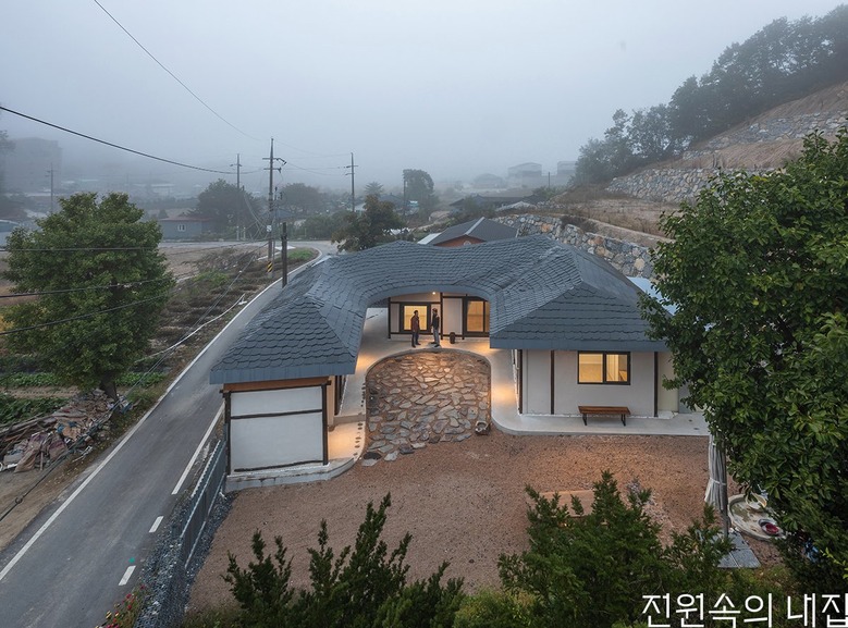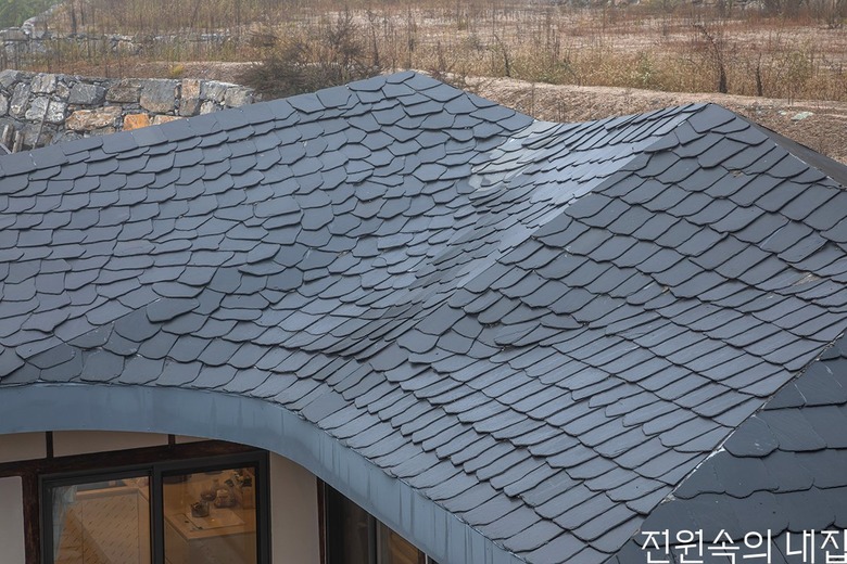 넘실대는 형상의 지붕은 금속틀을 기존 목구조를 피해서 설치하는 방식으로 제작했다. 지붕의 외부 마감재로는 천연슬레이트를 시공해 치밀한 설계 계획 의도를 넘어 패턴을 결정해나가며 만들었다. 이렇게 어긋나게 자리한 두 채를 지붕이 하나로 이어 준다. 뒷산의 능선을 닮아 여러 경사를 가진 지붕은 묵직하게 집 위에 눌러앉은 모양새다.