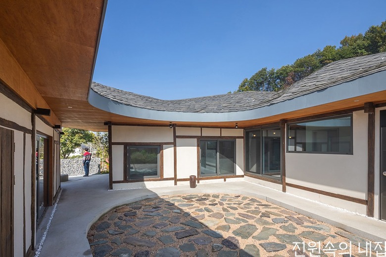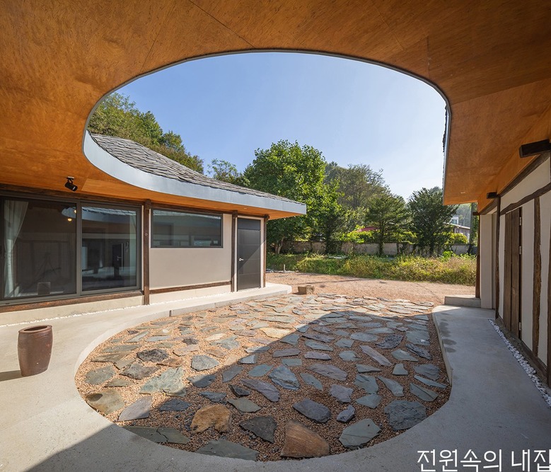 마당은 동쪽을 향해 시야가 시원하게 개방돼 바람이 드나드는 길이 되었다. 50년이 넘은 서까래와 행랑채의 창고 문은 세월의 멋으로써 그대로 살렸고, 마당에 있던 기존 구들장도 조경석으로 활용했다. 원래 있던 서까래도 남겨둔 채 그 위를 합판으로 겹겹이 덮어서 시공했다. 부정형의 나무와 유사하게 얹혀 기존 모습과 조화롭게 만들기 위함이었다.