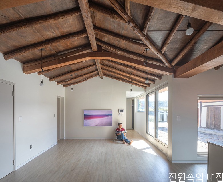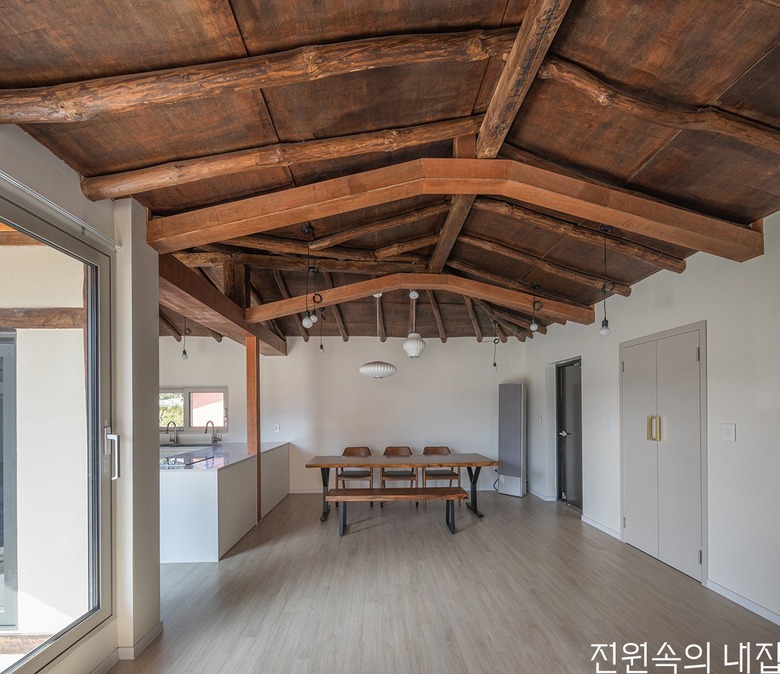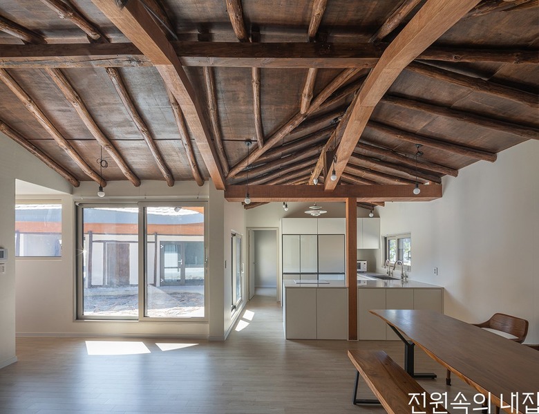 김 소장은 무엇을 비우고 드러낼지, 무엇을 남기고 덧씌울지 고민했다. 옛집은 각각 형태도 다르고 역할도 다른 ㄱ자 본채와 ㅡ자 행랑채가 ㄷ자 형태로 마당을 에워싸는 형태로 배치돼 있었다. 이를 그대로 살리되 실 구성에는 변화를 주었다. 기존에 방 3개가 있던 본채는 방 1개를 거실로 탈바꿈했고 채광을 위해 창을 내 기존의 모습을 그대로 유지하기는 어려웠다. 본채 거실과 주방은 ㄱ자 공간의 연결부에 조성했고 양 끝단에 방을 2개 조성했다. 방의 벽면은 천장까지 올리고 페인트로 마감했다. 이로써 거실과 주방은 하얀 벽면을 양쪽에 두고 높은 천장고를 갖게 되었다.