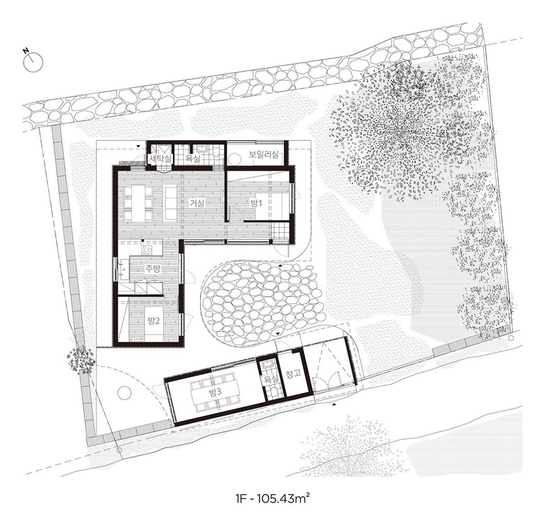 본채에는 코너에 위치한 거실과 주방을 사이에 두고 2개의 방이 양끝에 위치해 있다. |