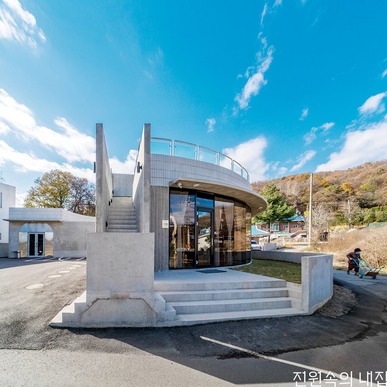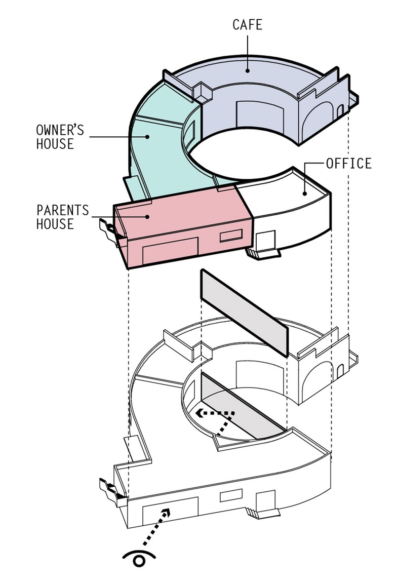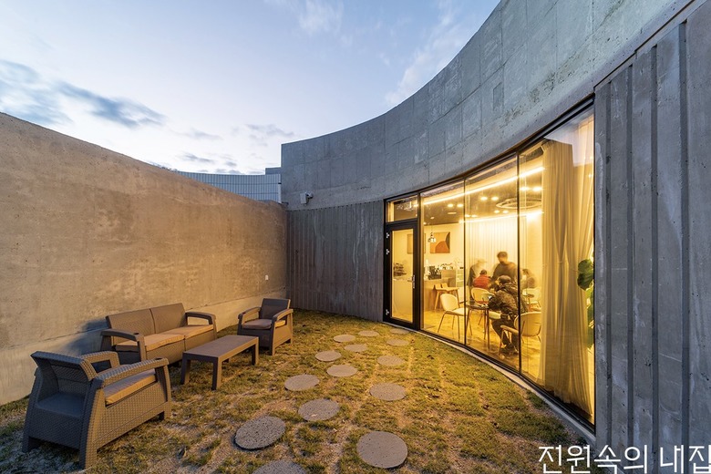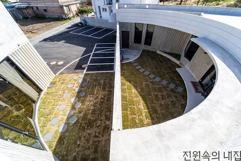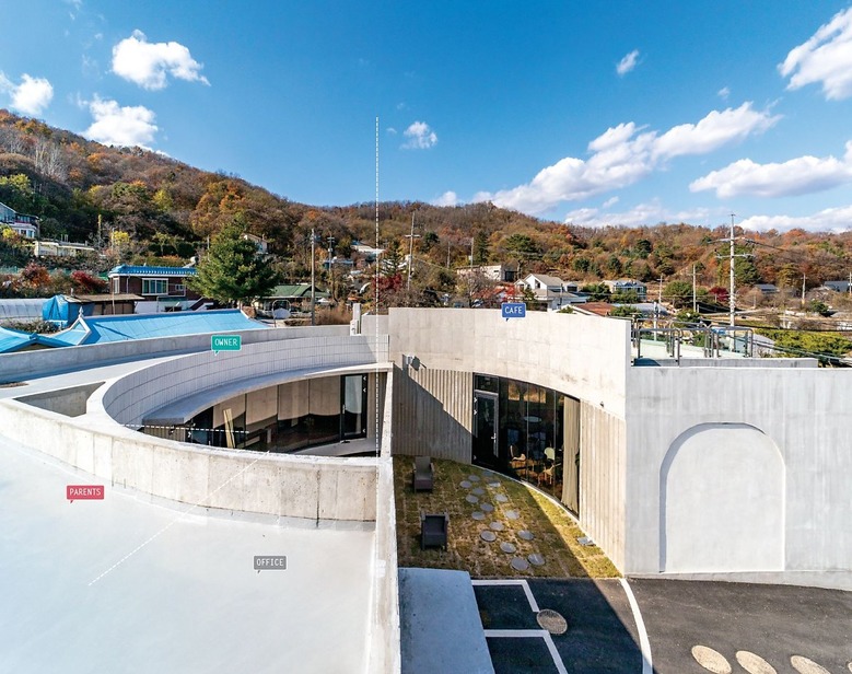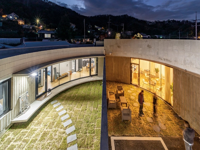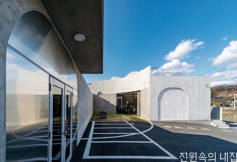 카페는 굽어진 시골 마을 교차로를 받아들인다. 카페에서 외부 주차장으로 연결된 미완의 원형 중정은 테라스 공간으로 확장된다. 내부 중정과 카페 테라스, 옥상은 서로 교차하며 소통한다. 나아가 카페와 주택도 서로 연결돼 이어지며 합쳐진다. 카페의 주방은 건축주 세대의 주방과 중정을 따라 최소 동선으로 만날 수 있도록 했다. 이로써 실내는 중정을 비롯한 외부 공간으로 확장되고 둥근 중정 집은 개인적인 공간이면서, 모두를 위한 건축물이 된다.