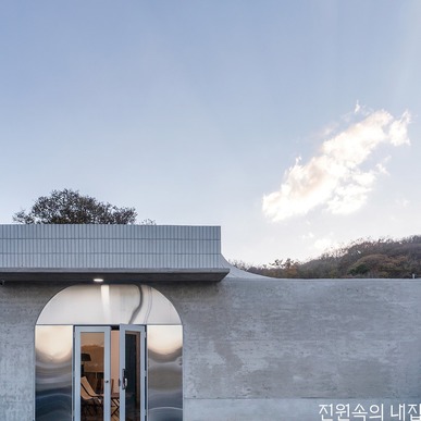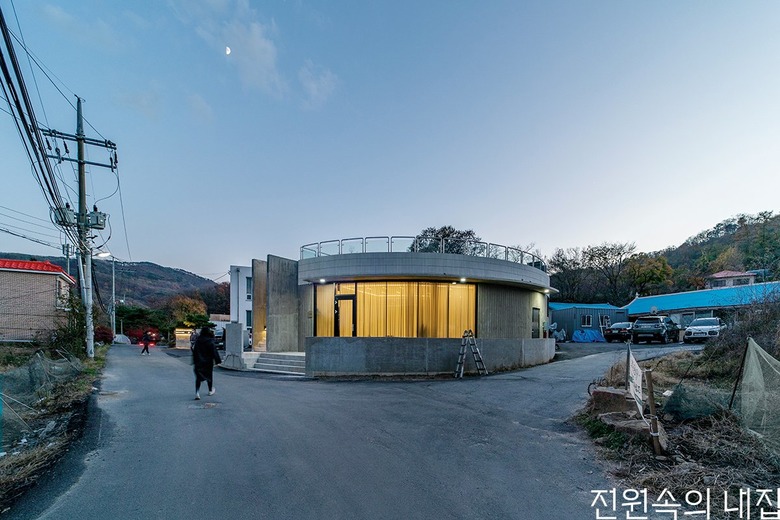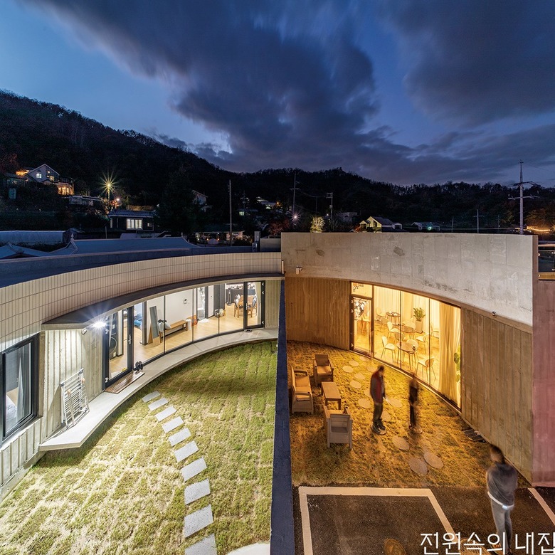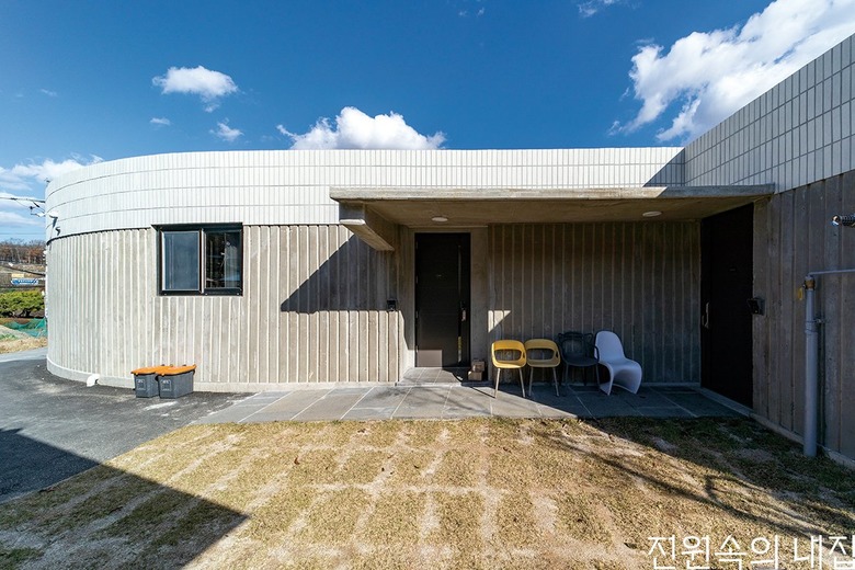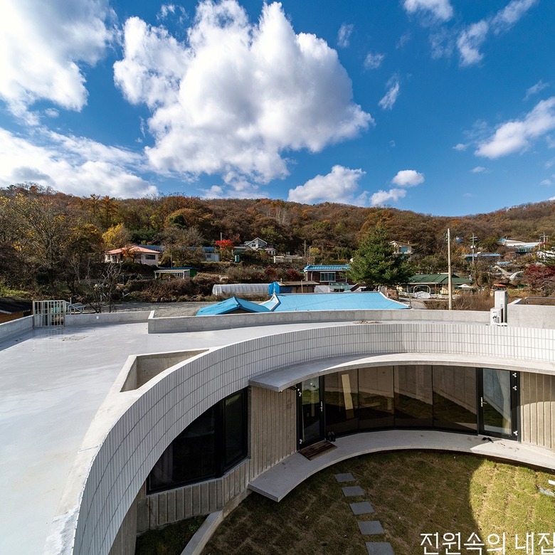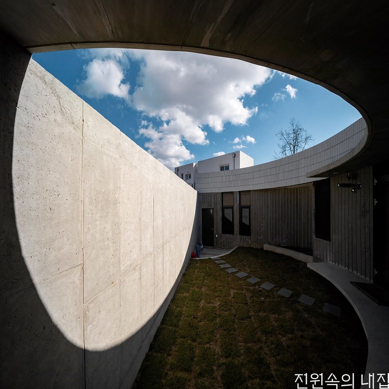 용인 두창저수지 낚시터 인근 조그마한 마을에 자리한 ‘둥근 중정집’은 건축주 세대와 부모님 세대, 카페로 이뤄져 있다. 건축주는 가족이 함께 모여 살면서 카페도 운영할 수 있는 집 짓기를 희망하였다. 개인 공간과 상업 공간이 어우러지면서 3대가 조화를 이루며 살 수 있는 집을 위해 둥근 중정을 품은 원형의 주택 모양이 설계되었다.