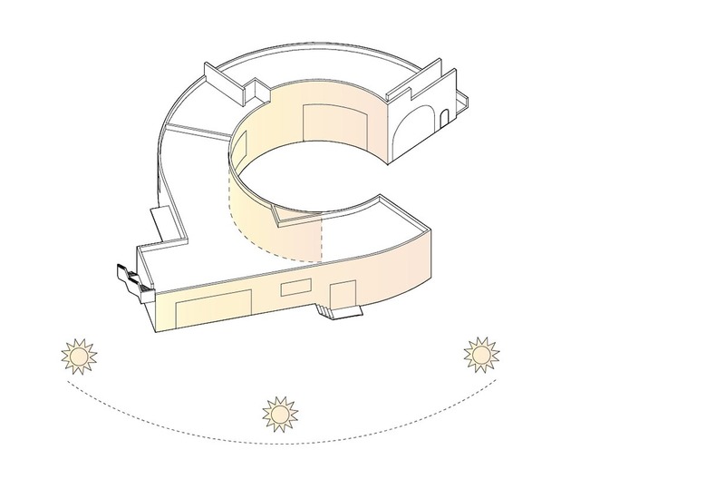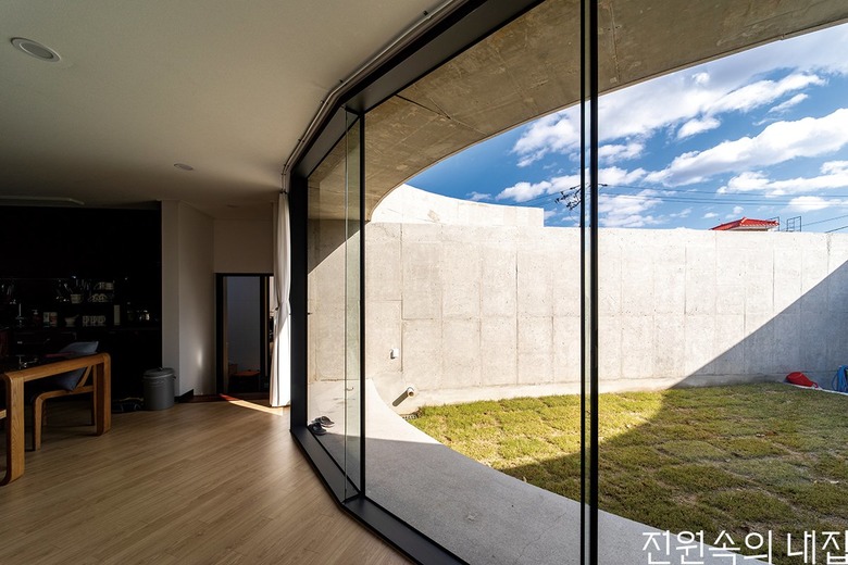 ![]() 중정을 향해 둥글게 전창을 내 더 많은 시간동안 채광을 넉넉하게 확보한다. |
