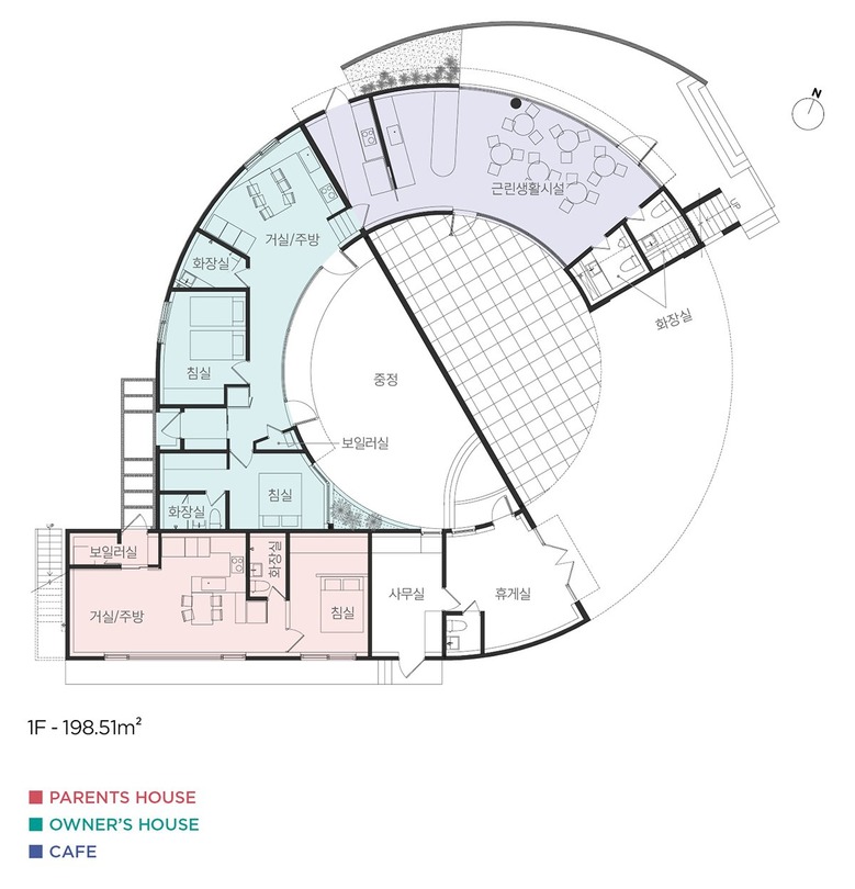 (아래부터 시계방향으로) 사무 공간 / 부모님 공간 / 건축주 부부의 공간 / 카페 |