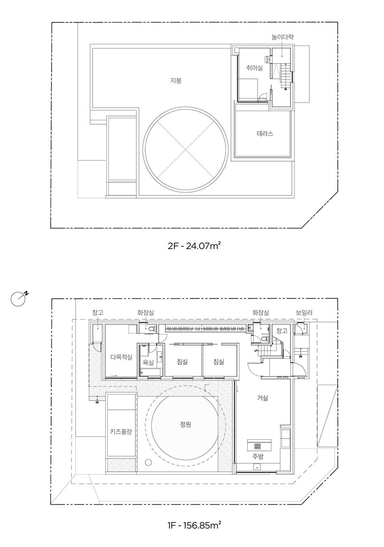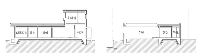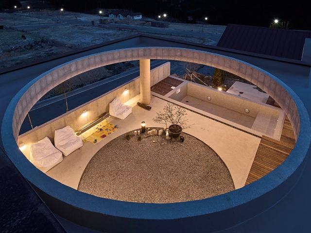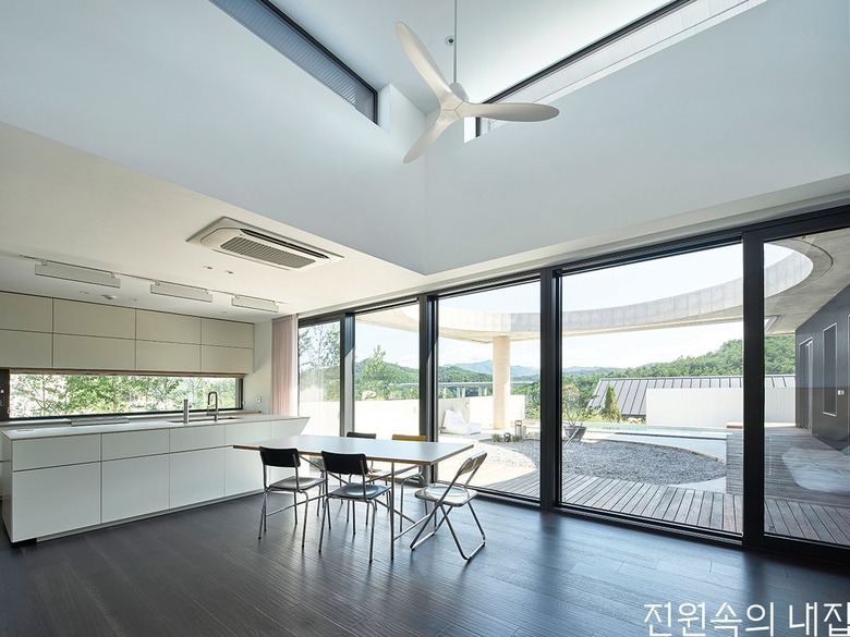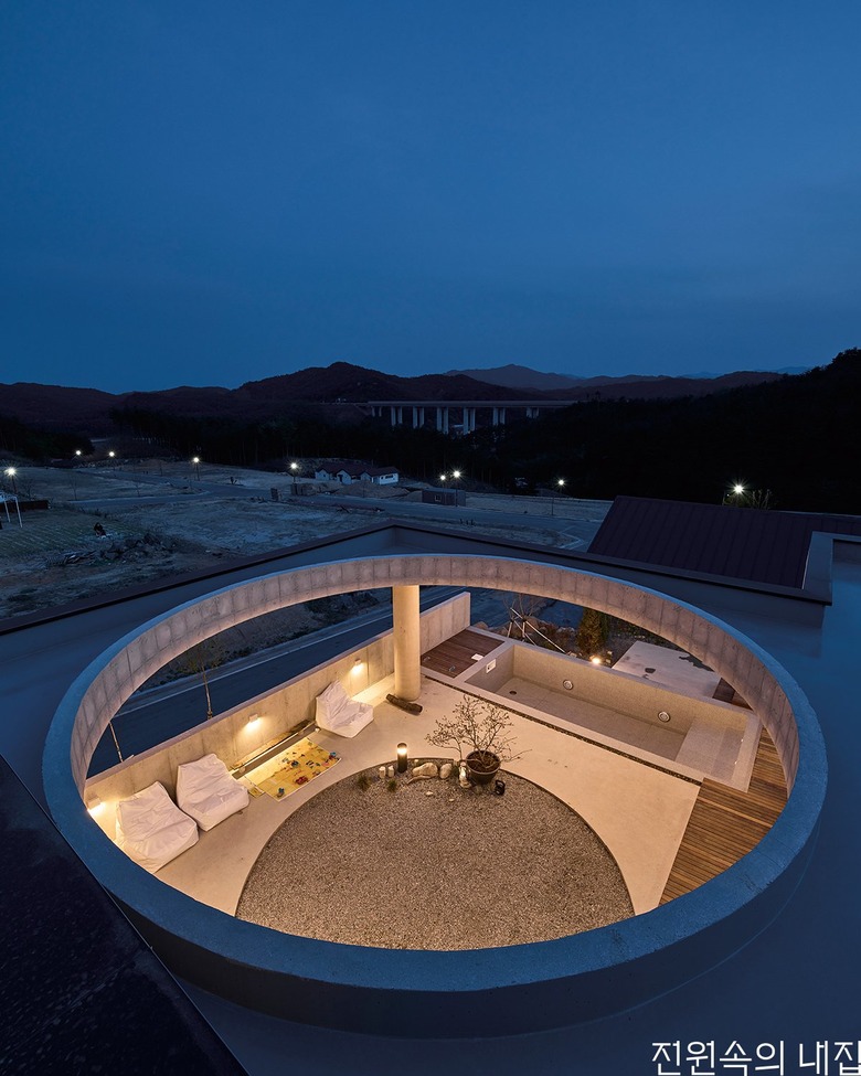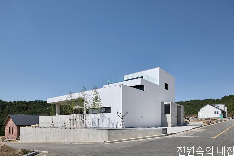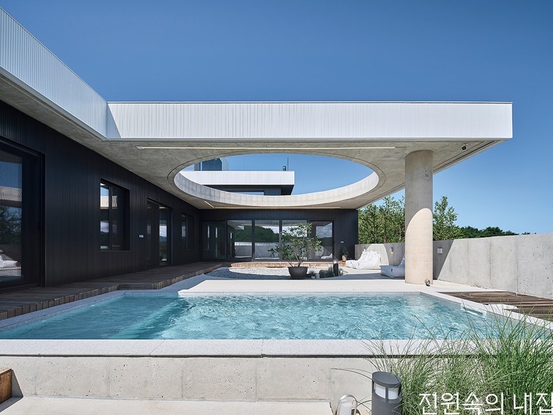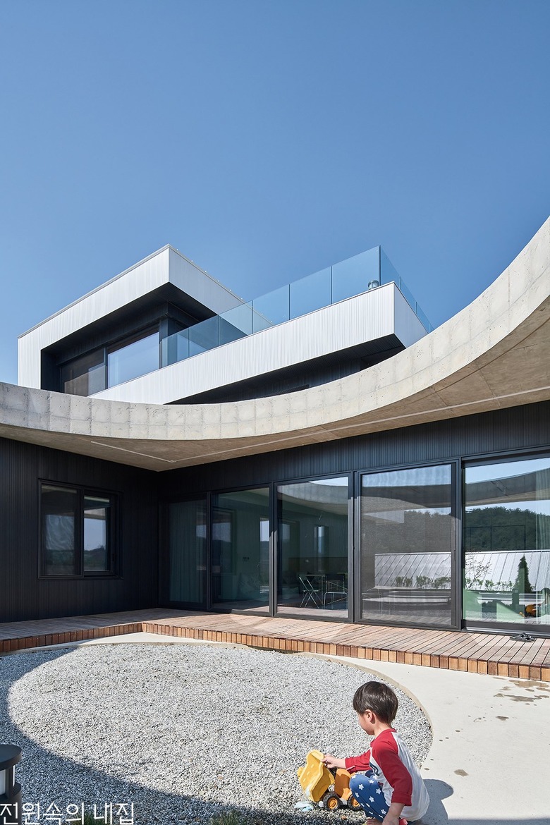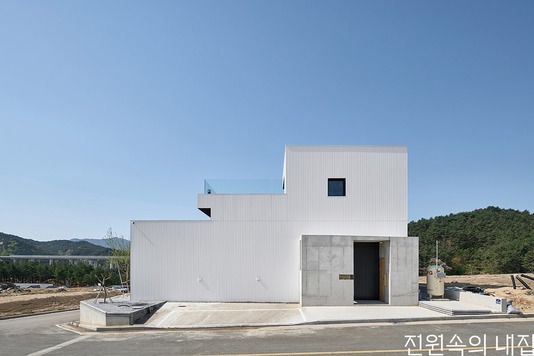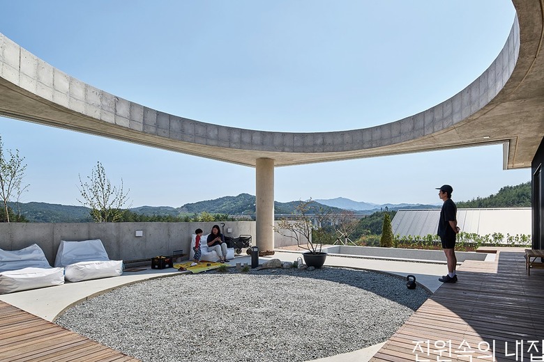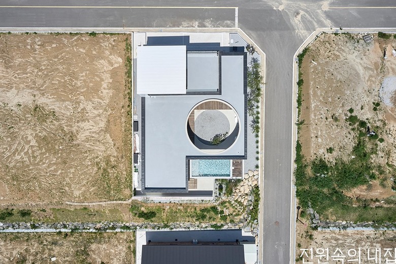 집의 본채는 ‘ㄱ’자 형태로 남서쪽에 개방된 풍경 방향으로 앉혔다. ‘ㄱ’자 집의 지붕은 크게 연장되어 집의 큰 틀을 이룬다. 건폐율과 공사비를 고려하여 지붕의 중앙은 원형으로 크게 오픈시켰다. 온전한 바깥이더라도 큰 틀 안에서 날씨와 하늘의 변화를 담는 흥미로운 외부 풍경이 집의 각 부분과 밀접하게 연결되도록 했다.