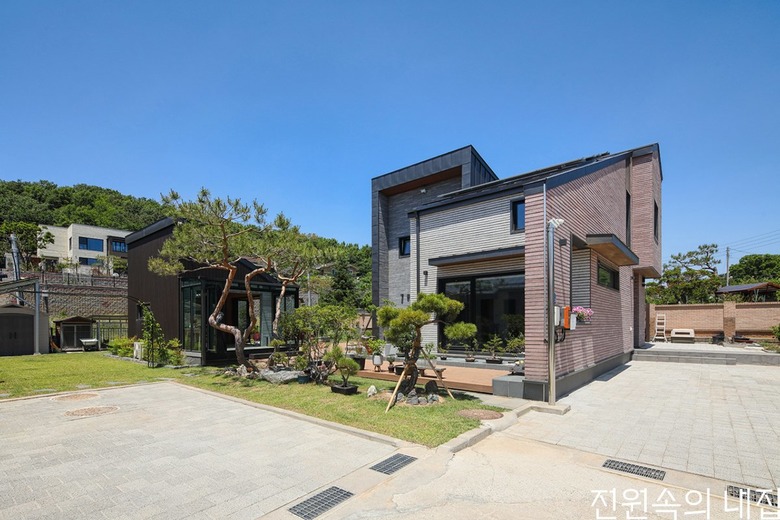 두 집 동시 설계인 만큼 외부공간에 있어서 적절한 구분과 이질감 없는 통합에 신경을 썼다. 메인 지붕선을 서로 대칭되게 맞추고 보조선을 엇각으로 주어 긴장감을 주었다. 마당색에 대비되도록 외장마감은 로즈타일로 통일감을 주고 하드우드합성목으로 포인트를 주었다.