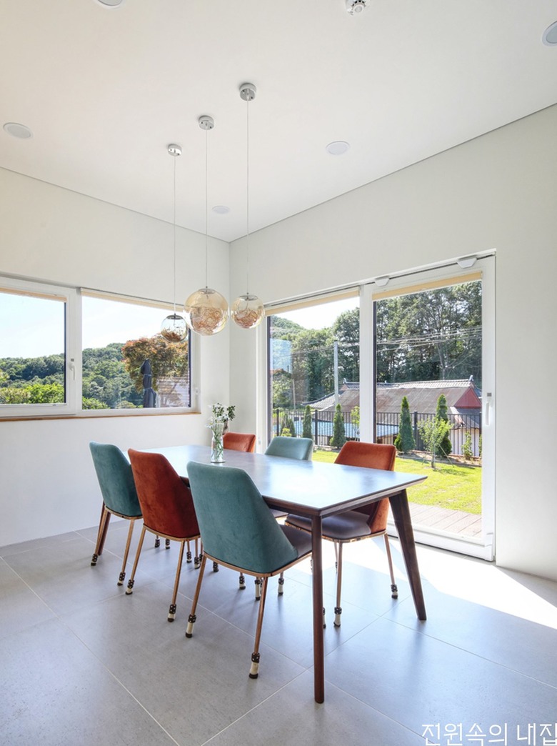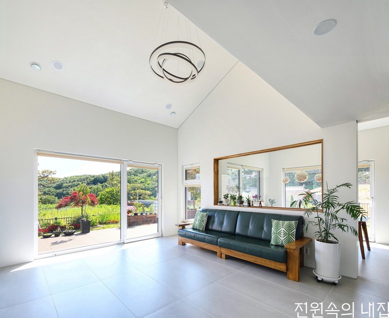 실내공간은 각 집의 개성이 반영되었다. 기본적으로 마감 색조는 두 집 다 화이트톤에 밝은 타일 중심으로 마감했으나 공간감은 사뭇 다르다.