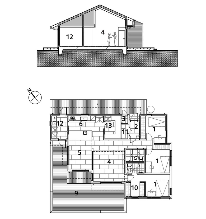 1 방 2 현관 3 보일러실 4 거실 5 응접실 6 주방 7 썬룸 8 가족실 9 데크 10 드레스룸 11 창고 12 다용도실 13 팬트리 |