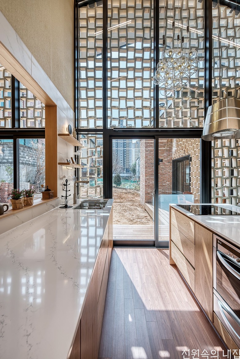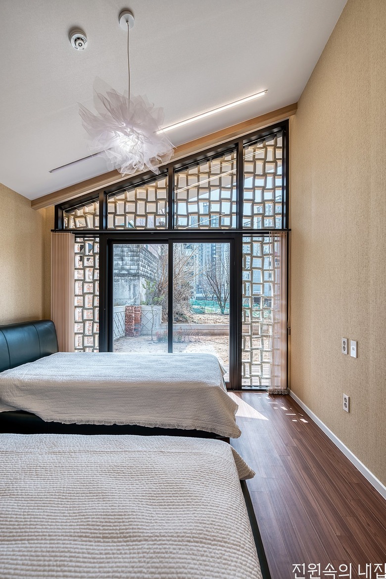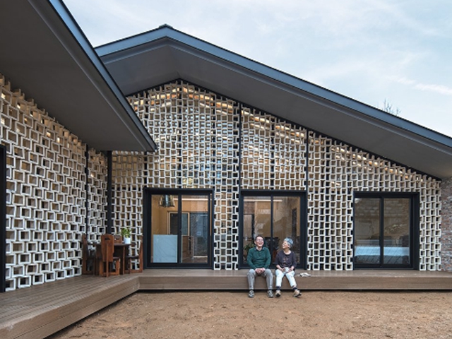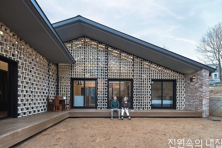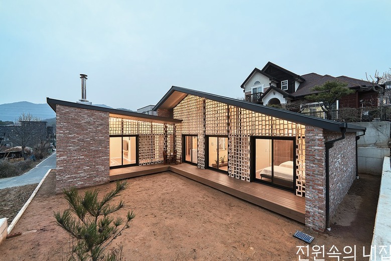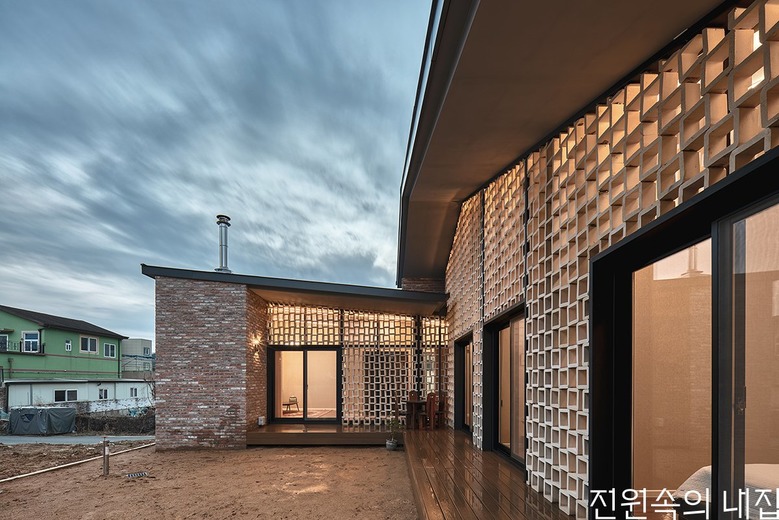 편안한 모양새로 알뜰하게 지어진 집을 특별하게 만들어주는 것은 커다란 창으로 마감된 집의 전면에 쌓아 올린 블럭이다. 규칙적으로 올라간 블럭은 집에 현대적인 요소를 더해주고, 집 안으로 쏟아지는 빛의 아름다운 산란을 느낄 수 있게 해준다. 밤이 되어 툇마루에 앉으면 내부의 조명이 블럭을 통해 밤하늘의 반딧불처럼 빛나는 모습을 볼 수 있다.