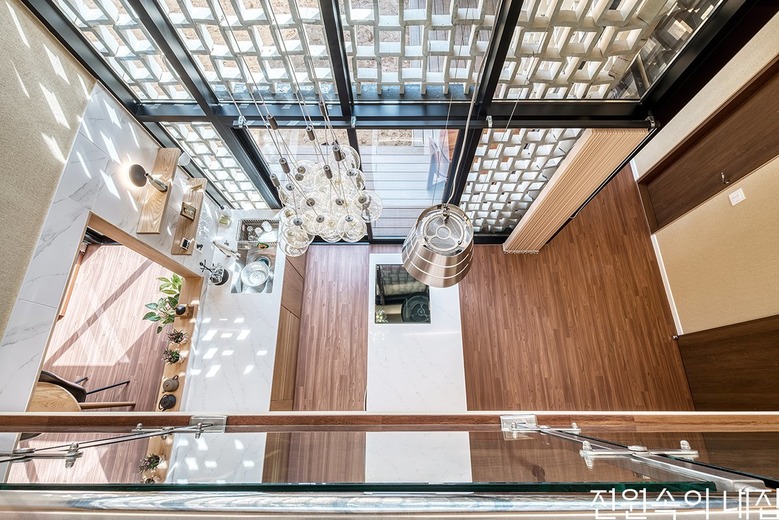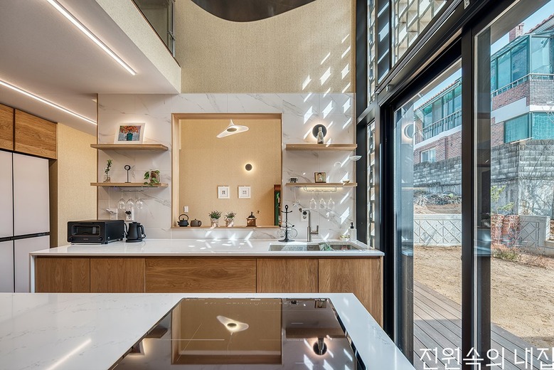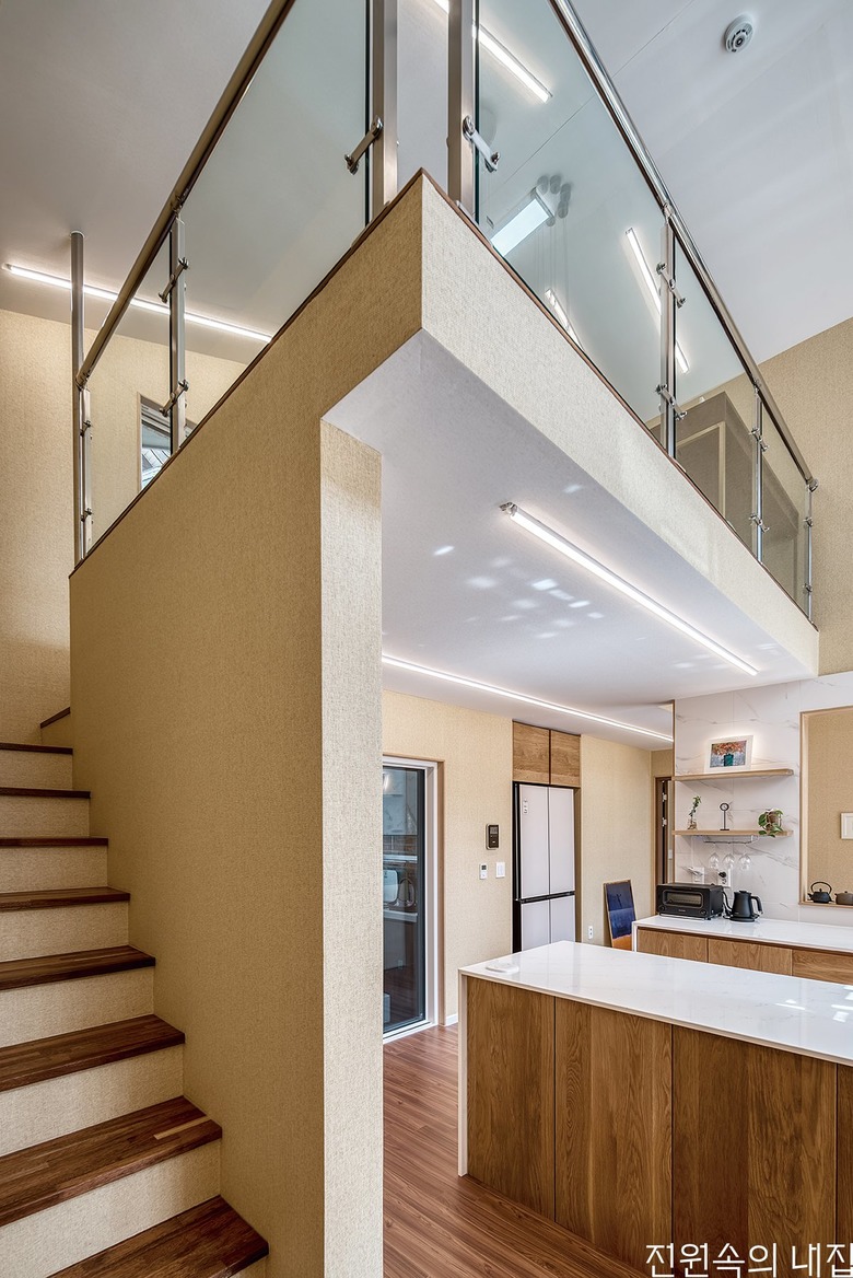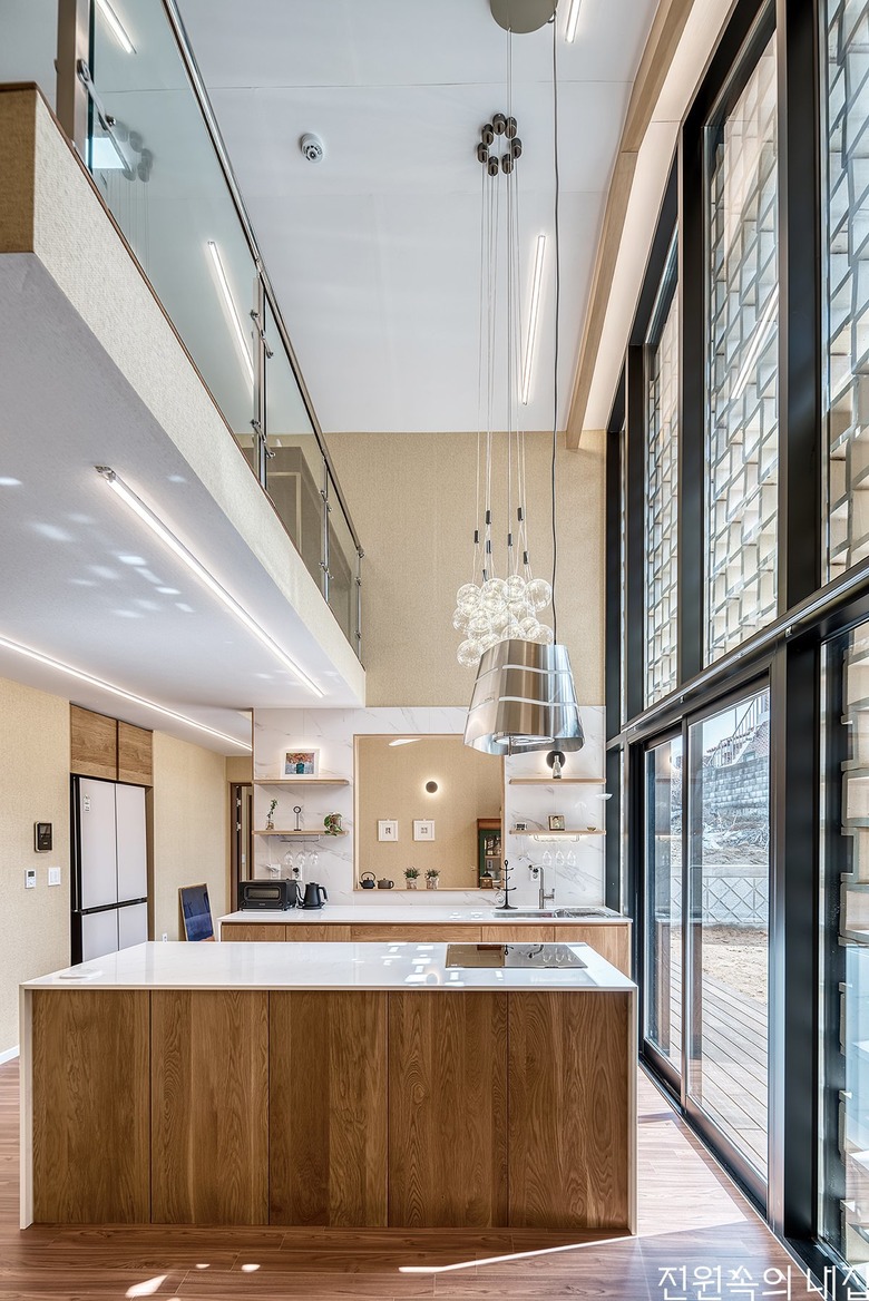 4,5_주방과 복도 위쪽으로 아내의 바람인 작은 다락이 구성되어 있다. 높은 층고와 천장까지 이어지는 큰 창 덕분에 다락에서도 테라스에 나와 있는 듯 시원한 개방감이 느껴진다. |