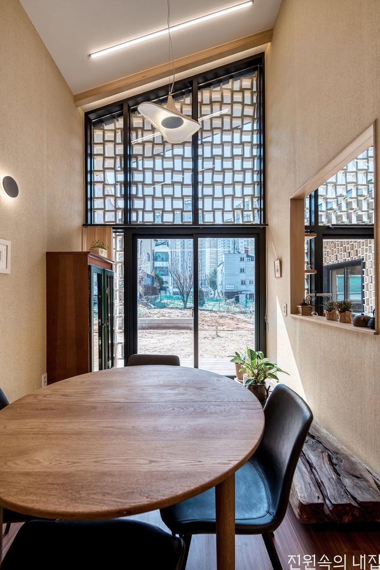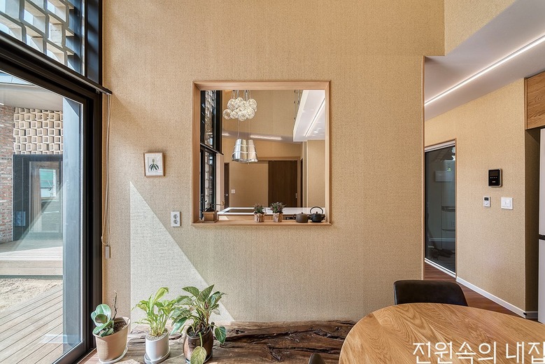8,9_주방과 안방 사이의 다실. 주방으로는 액자형으로 벽이 뚫려 있어 서로 소통이 가능하다. 지붕선에 따라 사선으로 떨어지는 유리창이 빛의 또 다른 재미을 보여준다. |