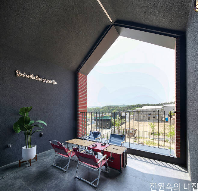 ![]() 가족의 또 다른 실내 속 야외공간인 2층 발코니. 벽면에는 네온사인으로 다섯 남매에게 하고 싶은 엄마의 말이 적혔다. |