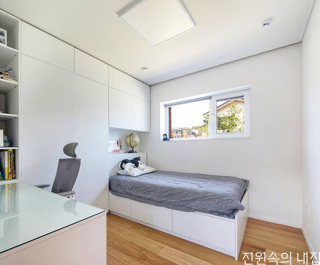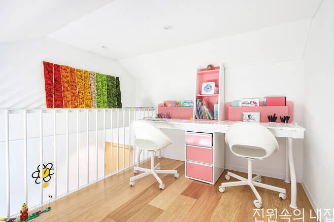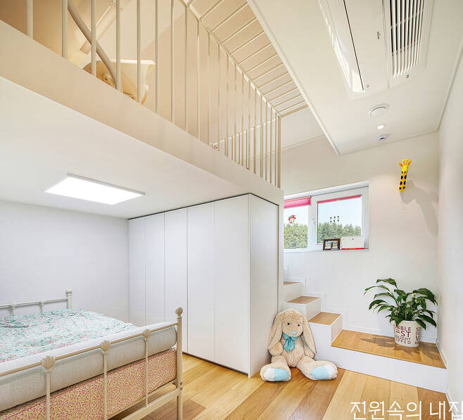 ![]() 1층에는 침대를, 2층에 책상을 두는 2층 구조의 아이방. 다락 대신 층고를 높여 가능한 구조였다. |