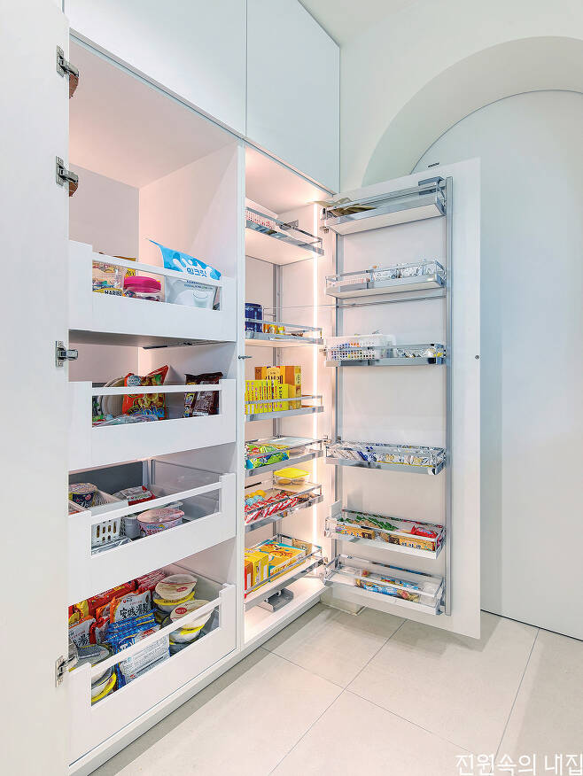 ![]() 가족들에게는 ‘편의점’으로 통하는 주방 수납장. Blum의 고급 주방하드웨어가 적용되어 넉넉한 수납공간과 사용감이 우수하다. |