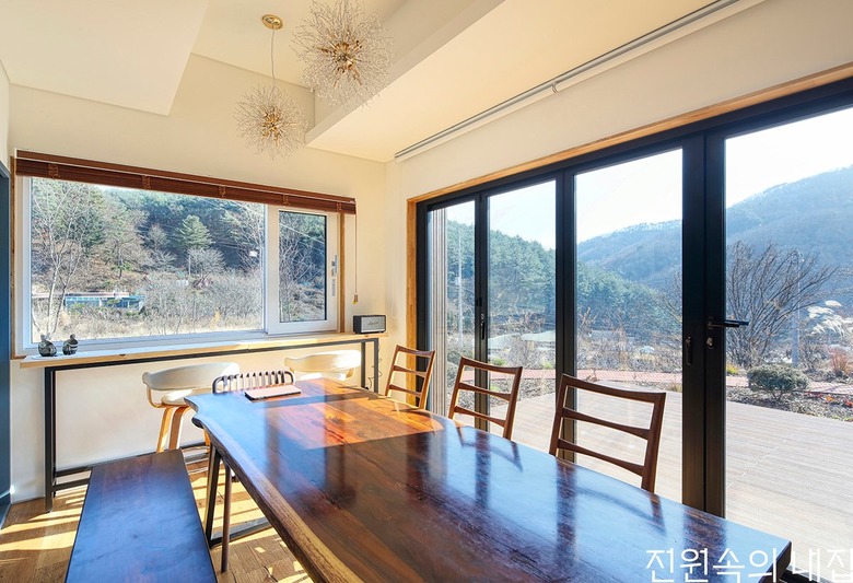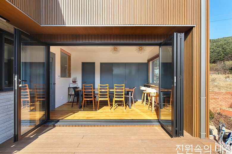 썬룸은 폴딩도어 뿐 아니라 측면 창도 와이드하게 두어 안에서 넓은 뷰를 확보할 수 있었다. |