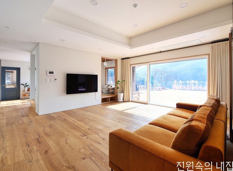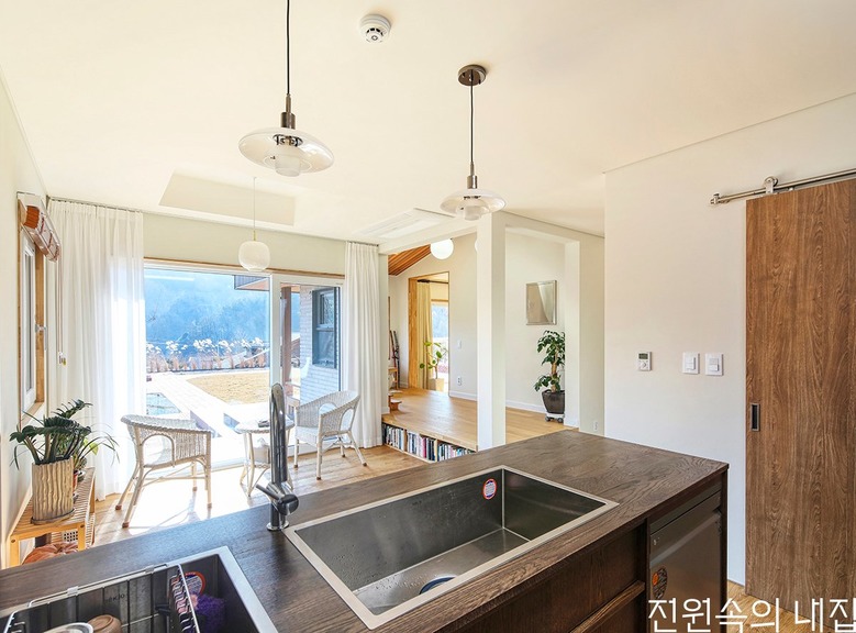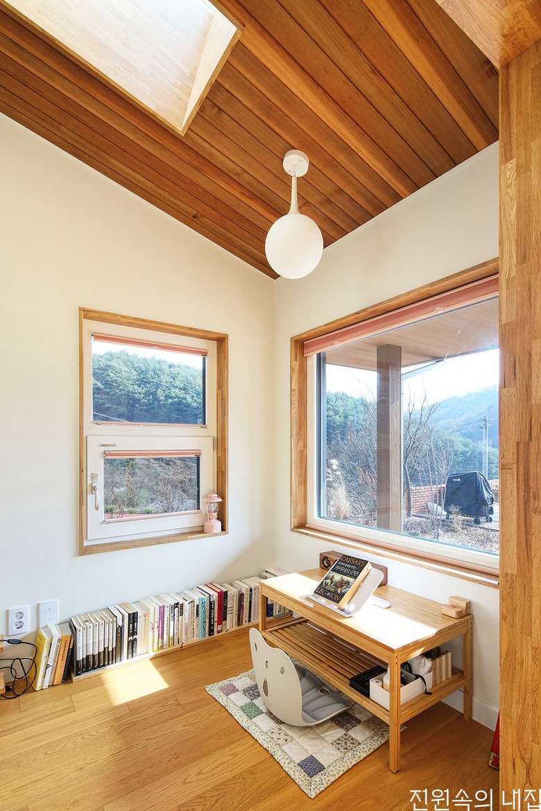 전체적인 인테리어는 화이트-우드의 따스함을 기본으로 삼았다. 주방가구는 원목으로 제작하여 자연소재 중심의 편안함을 추구하였다. 요리와 독서가 취미인 남편을 위해서는 거실에서 이어지는 툇마루 서재와 썬룸도 배치하였다.