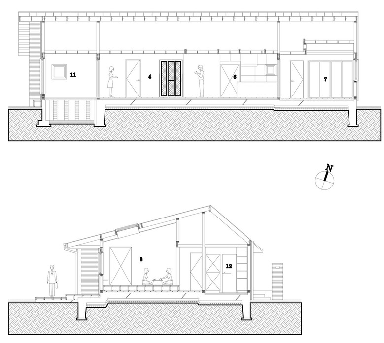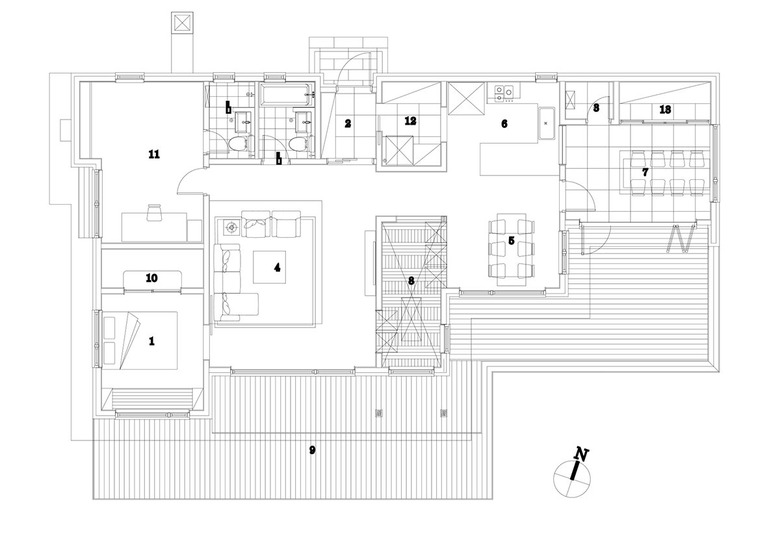 1. 방 2. 현관 3. 보일러실 4. 거실 5. 응접실 6. 주방 7. 썬룸 8. 툇마루서재 9. 데크 10. 드레스룸 11. 아궁이방 12. 다용도실 13. 팬트리