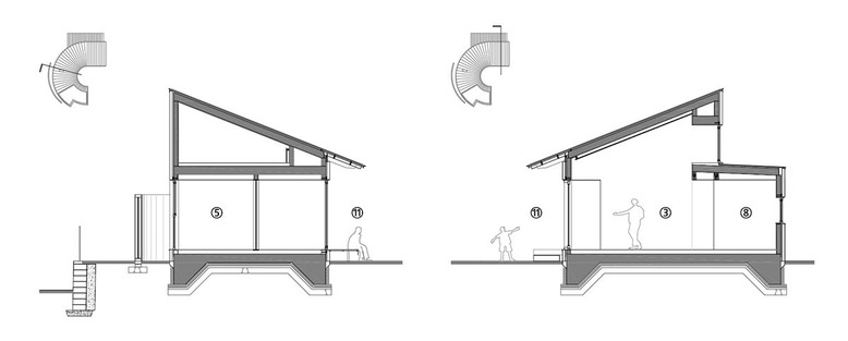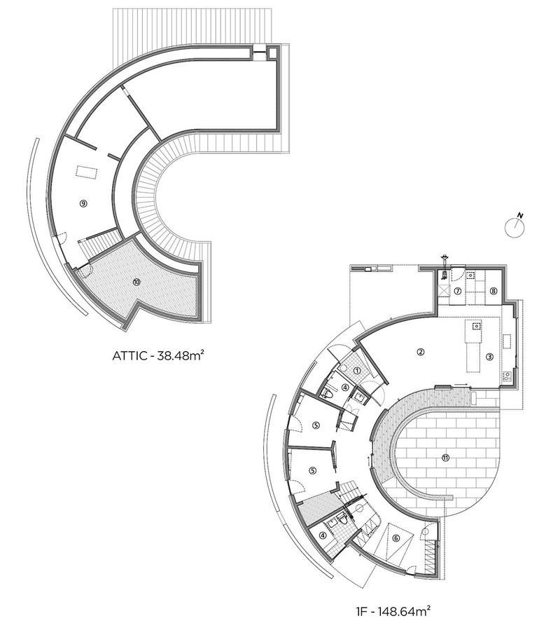 ![]() ① 현관 ② 거실 ③ 주방 ④ 욕실 ⑤ 방 ⑥ 마스터룸 ⑦ 세탁실 ⑧ 보조주방 ⑨ 다락 ⑩ 테라스 ⑪ 중정 |