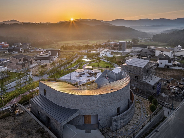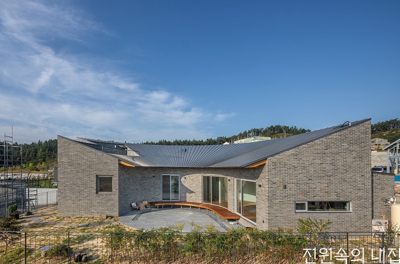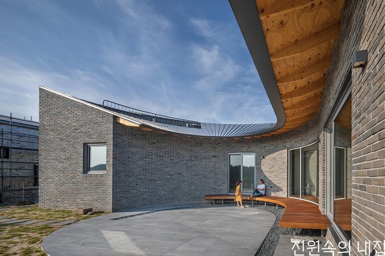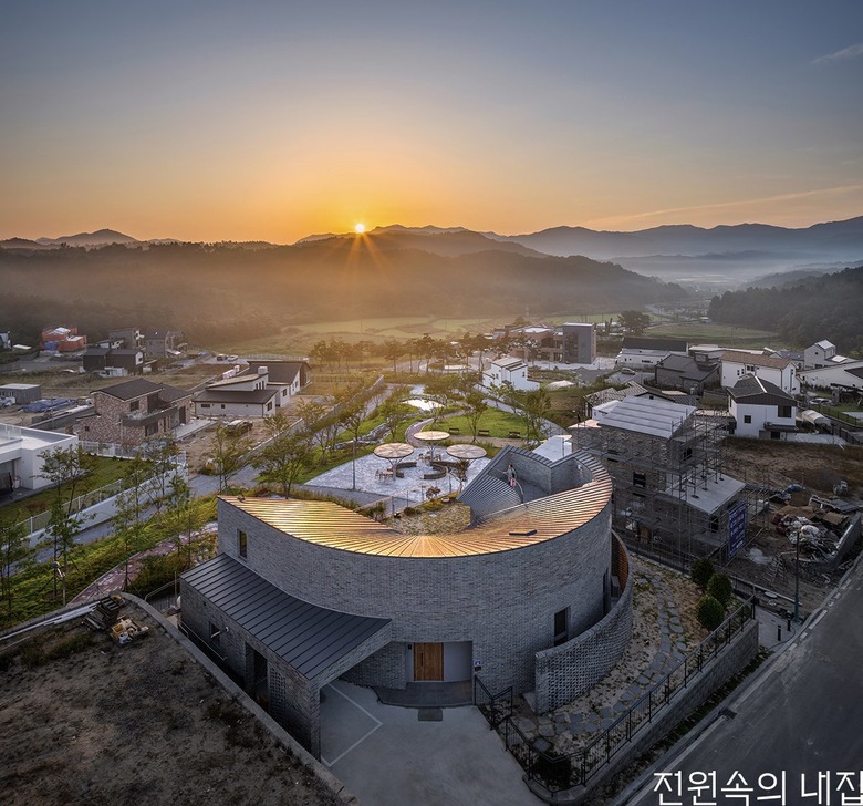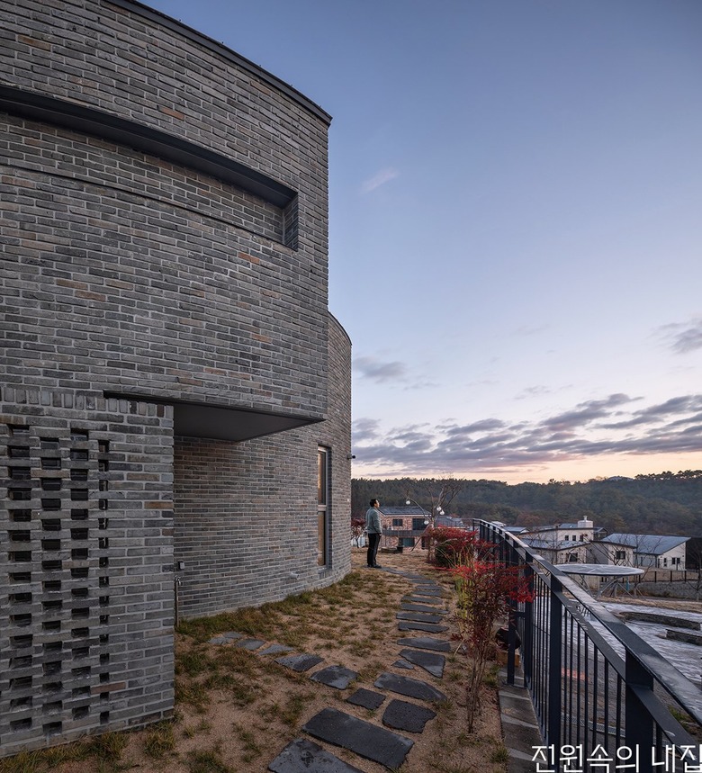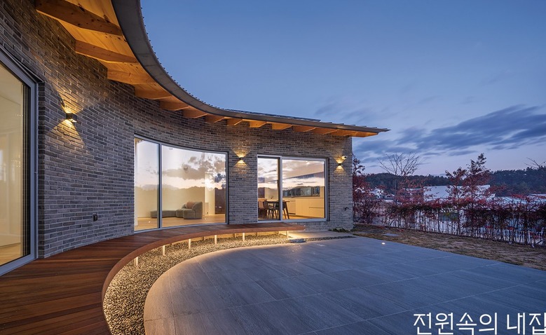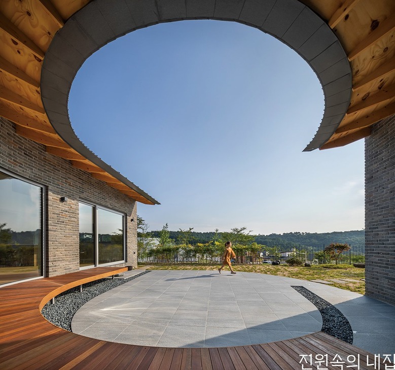 곡선 형태를 목구조로 구현하면서 함께 도출되어 만들어진 곡선 처마는 자연으로의 몰입감을 한층 깊게 유도한다. 동그란 집으로 둘러싸인 동그란 마당은 산의 풍경을 담기도 하고 때론 가족 구성원들만이 간직할 소중한 일상이라는 풍경을 담기도 한다. 글 : 김창균