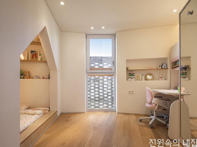 ![]() 도로로부터 시선을 차단시켜 주면서 빛과 바람이 통하는 반개구 가벽과 계단 하부 공간을 활용해 포켓 침대 공간이 적용된 아이방. |