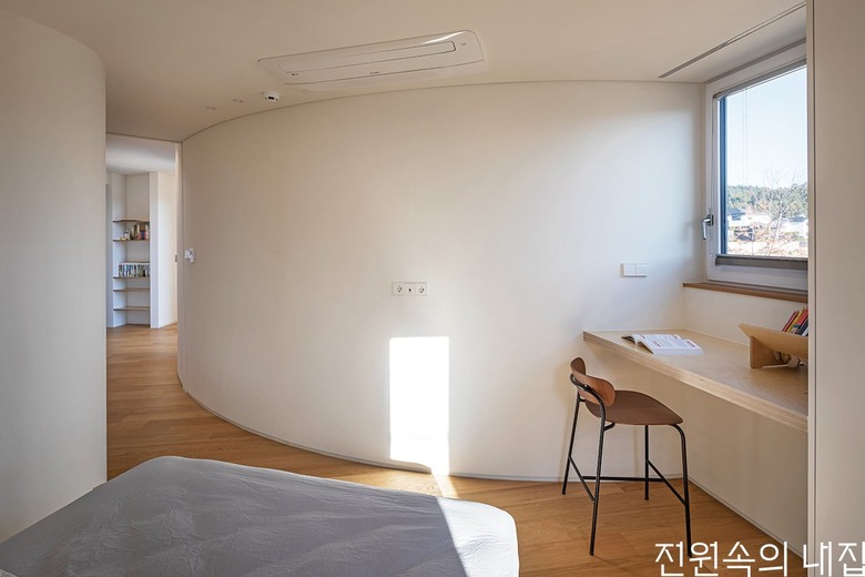 공용부인 거실주방 및 중정과 분리되어 개인 시간에 집중할 수 있는 침실공간이다. 곡선 벽체 덕분에 아이들 방 앞까지 시선이 깊숙히 닿는다. |