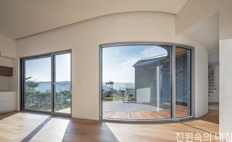 특이한 조형감이 다소 생소할 수 있다. 하지만, 동그란 집은 중정처럼 어느 정도 테두리가 있는 아늑한 마당을 가지면서 풍경을 깊숙하게 끌고 오기에는 충분한 형태였다.